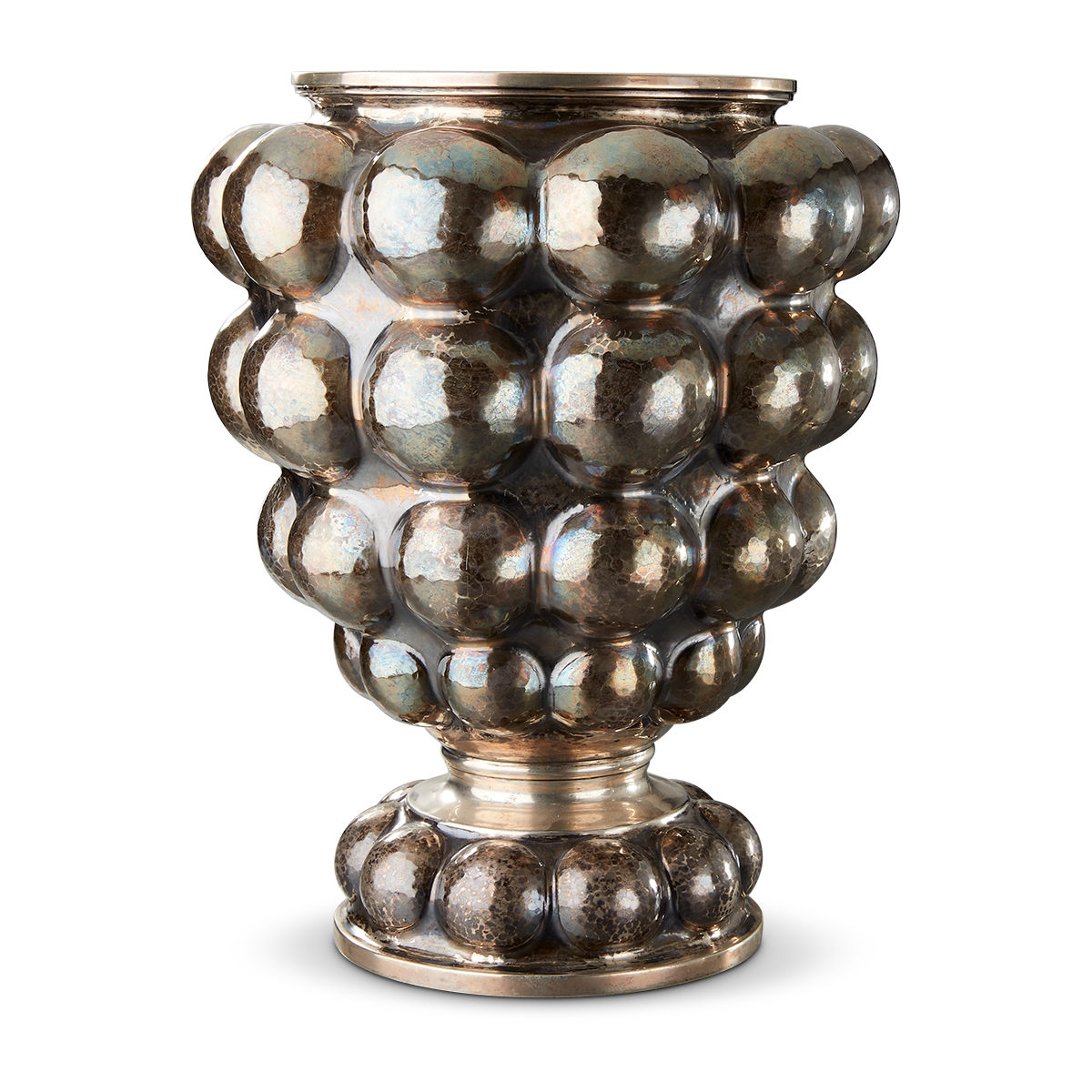 这款银色花瓶饰有所谓的“琢石”图案,上面有许多高高凸起的小圆形琢石。另一方面,锤击效果使银色抛光表面更为明亮。