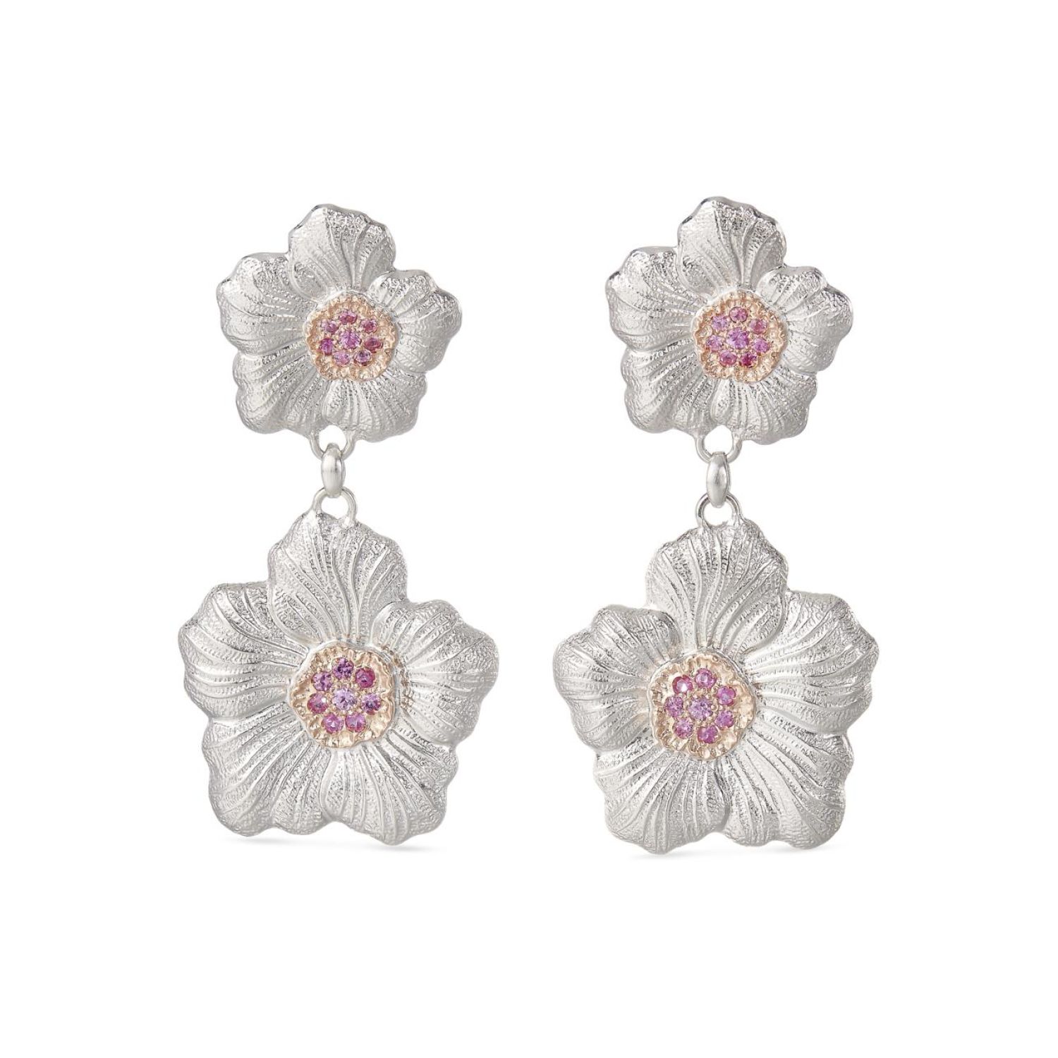 镶嵌蓝宝石的银耳环. 栀子花,直径:2.5厘米和3.5厘米 - 长度:7厘米