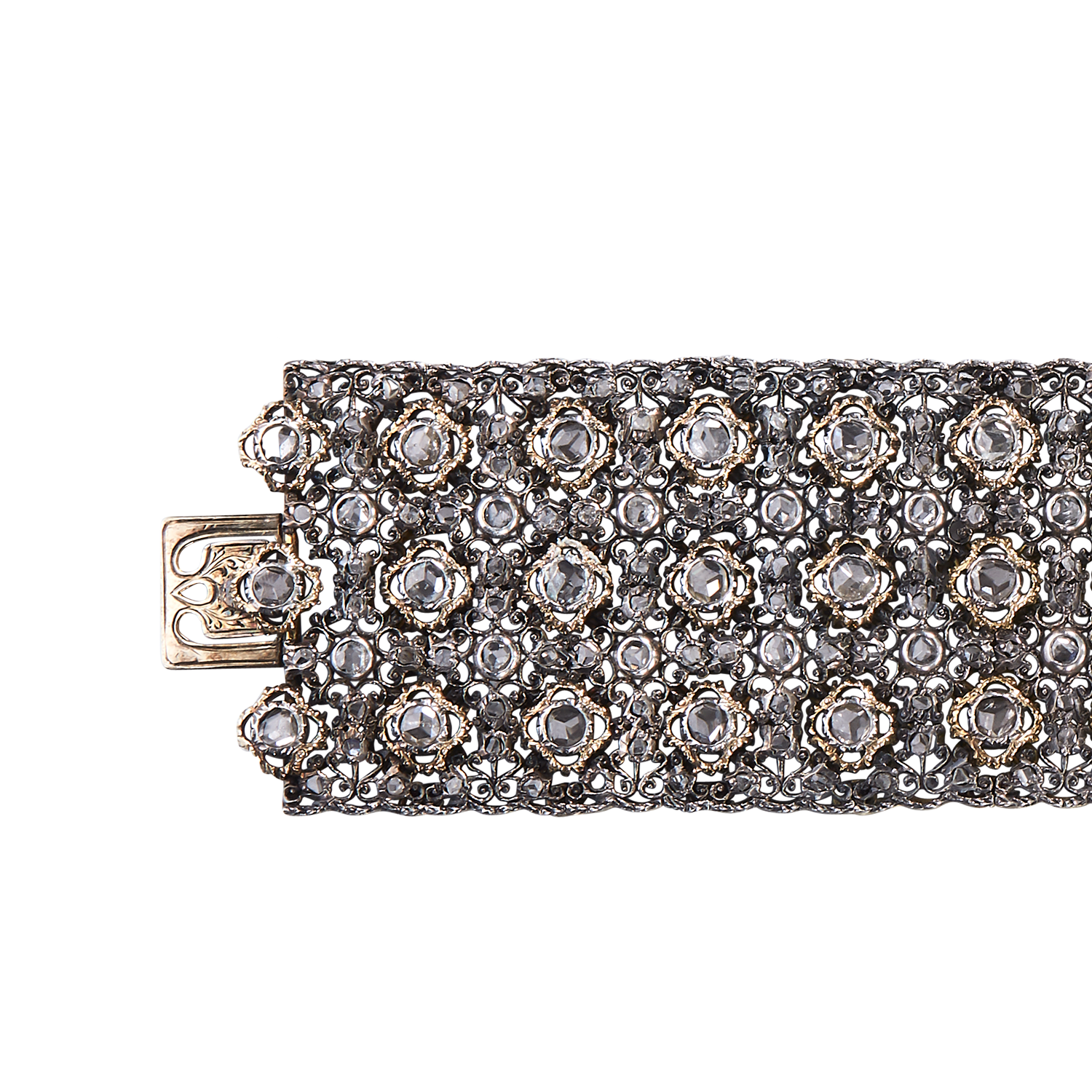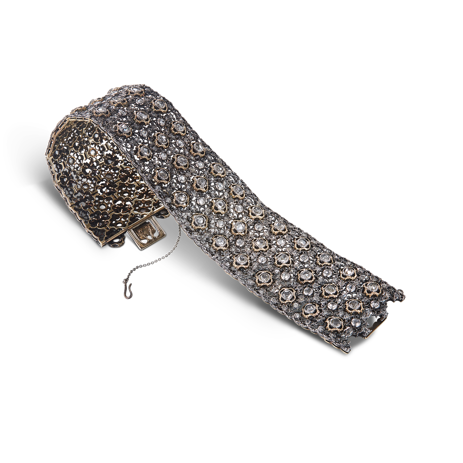 这款手链由镀铂银制成,内衬黄金,镶嵌57颗4.70克拉的古典切割钻石和284颗6.00克拉的玫瑰形切割钻石,这进一步提升了手链的设计美感。