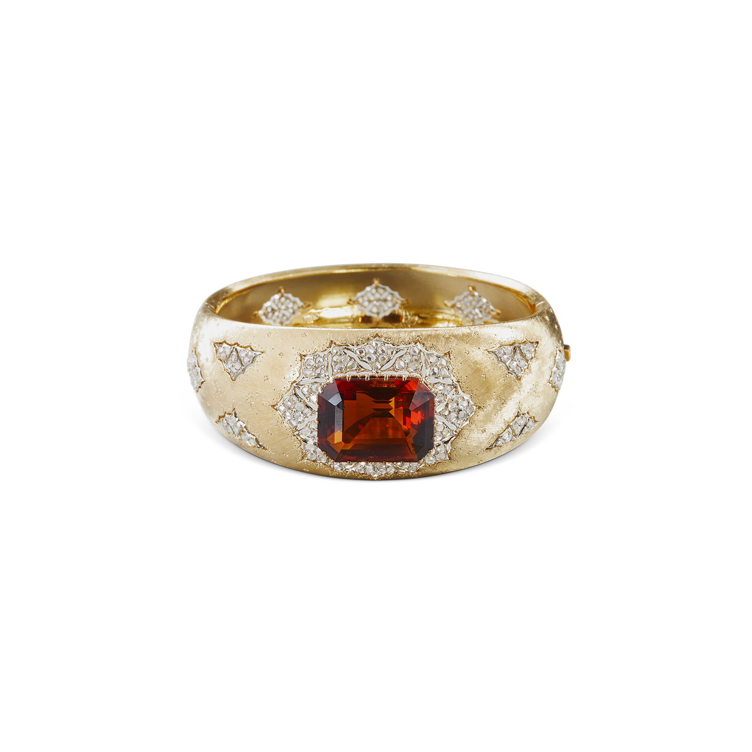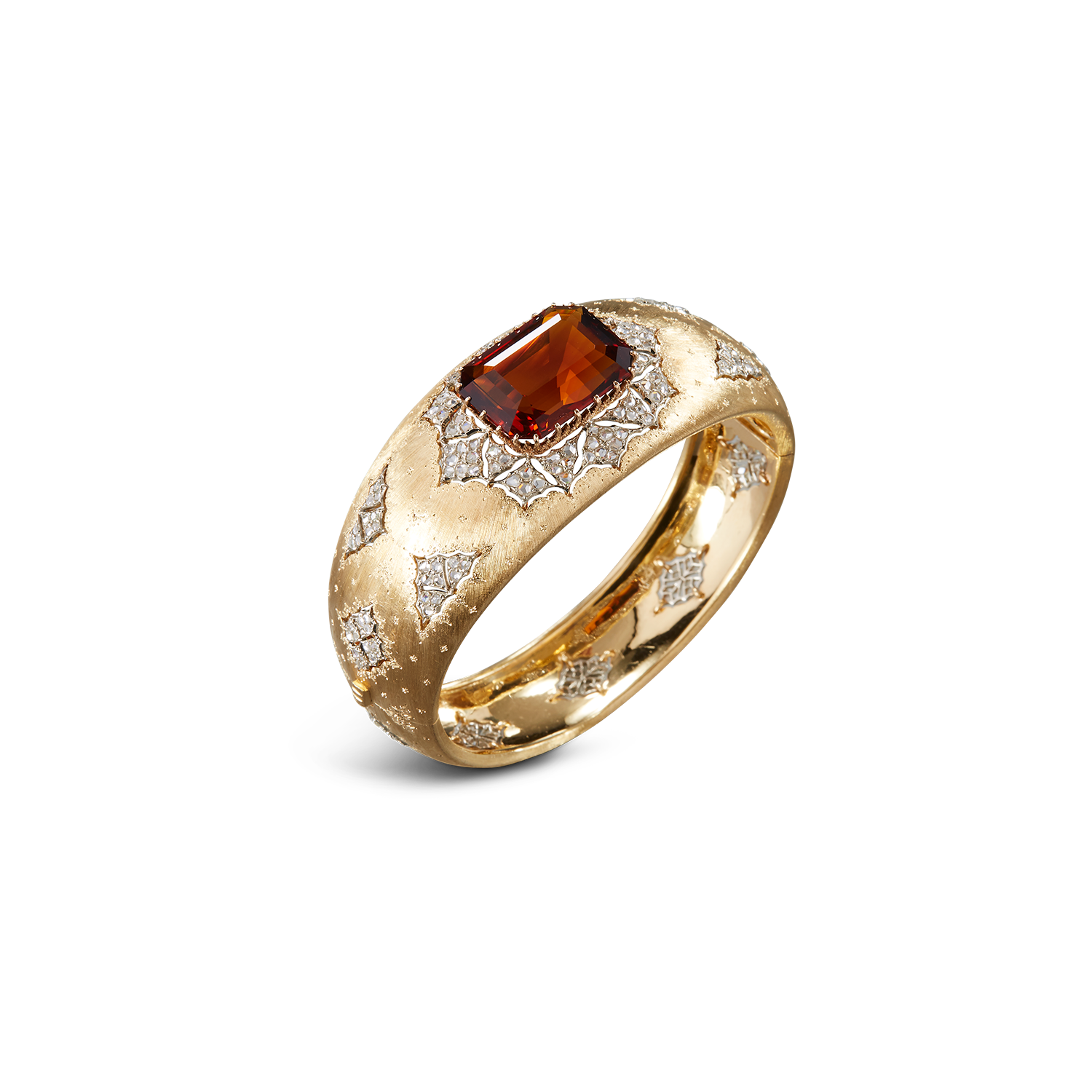 这款手镯即是如此,在黄金表面采用高度复杂的rigato雕刻工艺,而白金菱形和突出的18.70克拉马德拉黄水晶相得益彰,营造出无与伦比的精湛技艺。各种形状的超大装饰用204颗2.34克拉的玫瑰形切割钻石进一步点缀。