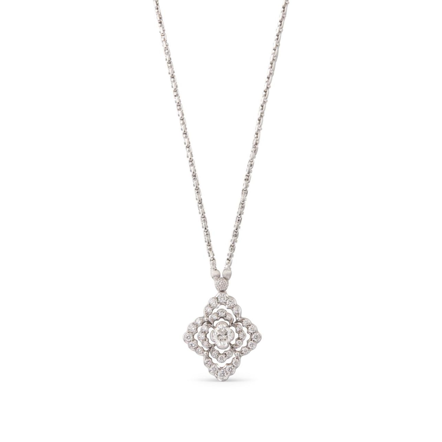设计线条与同名戒指如出一辙,因此可以一起佩戴,彰显Ventaglio吊坠特色。中心钻石重1.55克拉,创新的布契拉提式切割,专为房子百年庆典而创作。32颗圆形钻石(0.68克拉)以同心扇形围绕这颗钻石,再现了布契拉提徽标布置。闪亮的白金珠子将弯曲的部分分开,一颗润饰雕工纹饰的珠子将吊坠连接到Chiodino项链。当创意与线条要素邂逅,一种无可争议的永恒优雅油然而生。