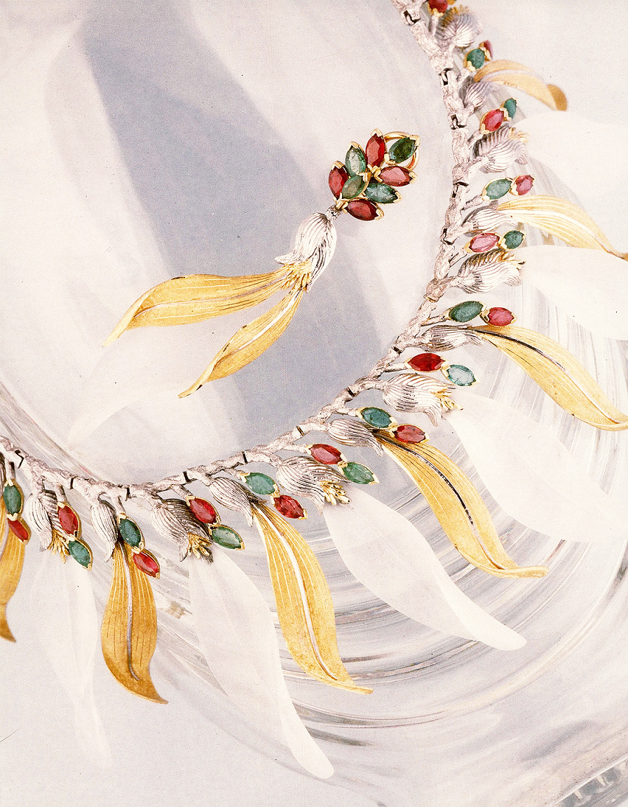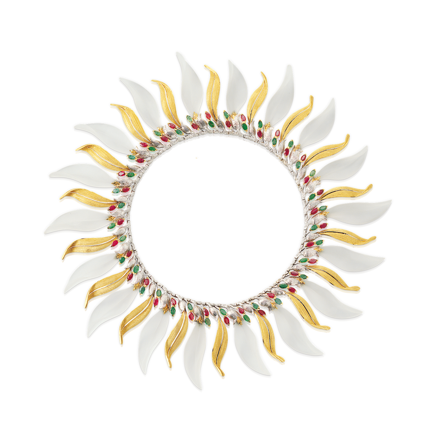 这条项链由18片白水晶披针形叶(167.60克拉)组成,交替润饰serignato雕工黄金叶片,堪称彰显布契拉提工匠精湛技艺的典范。将贵金属从笔尖的设计图稿变成珍贵的珠宝,方能使他们的艺术天赋无拘绽放。