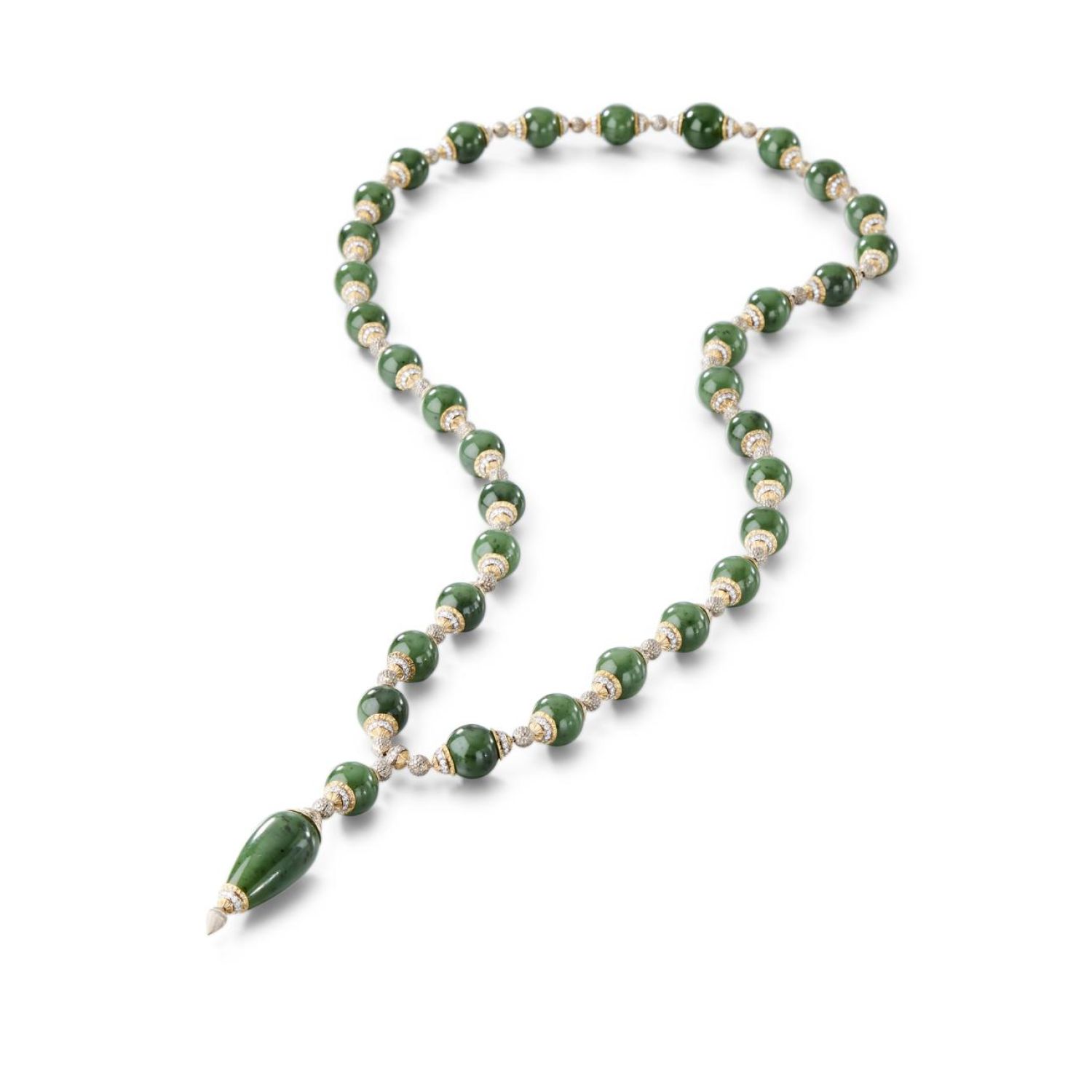 Ombelicale项链由镶嵌在黄金镶座中的翡翠元素组成,并饰有一排密镶钻石,交织嵌入白金冰碛石。