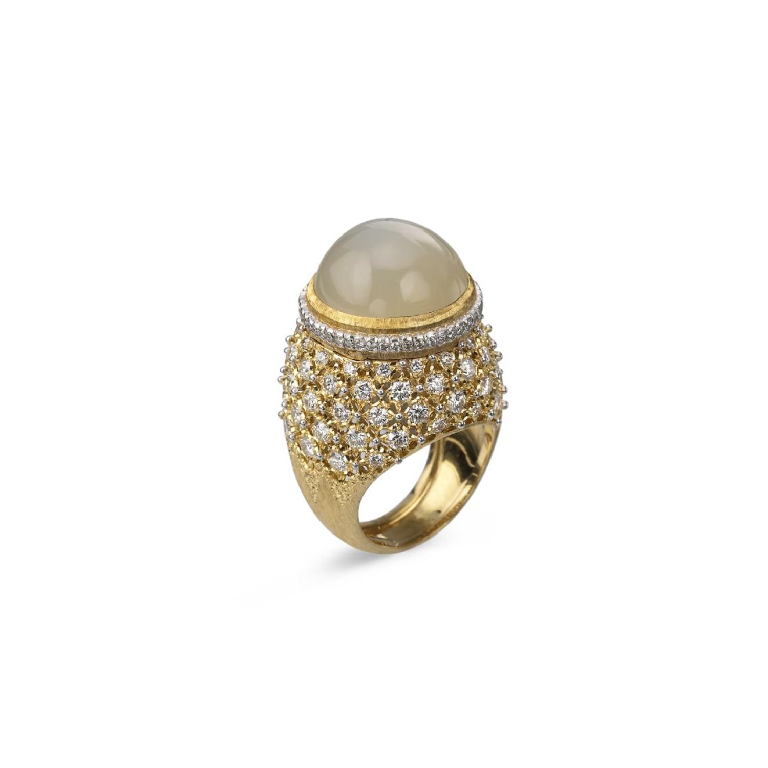 作为计时器的戒指:隐秘的时间令人惊喜,其低调内敛让人赞叹。镶有月光石的黄金饰件下有一块小表,呈放射状润饰rigato雕工纹饰,带镶钻数字。 戒指缀以明亮式切割钻石和ornato和rigato雕工纹饰,体现了纯粹的布契拉提风格。