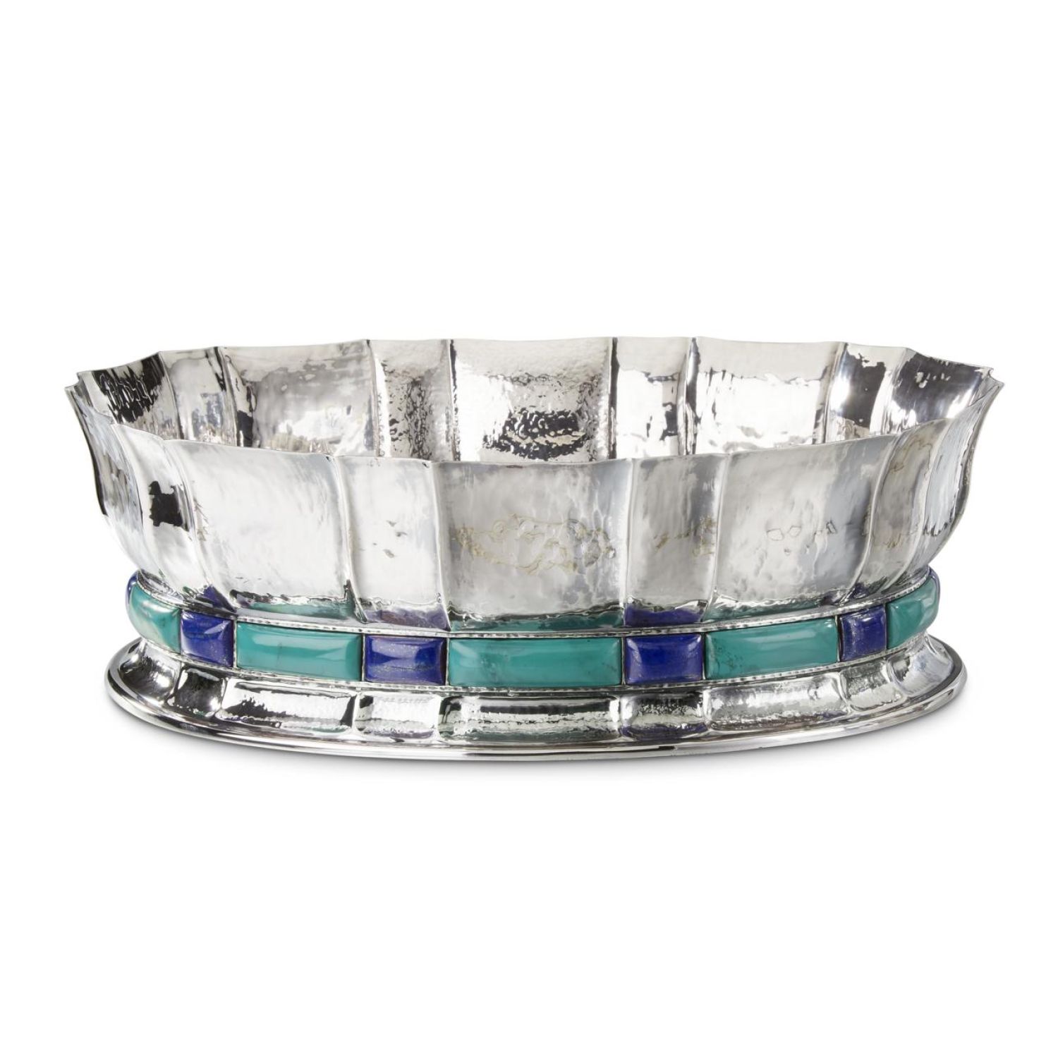 银碗,镶嵌青金石. 孔雀石和青金石款桌面摆饰。尺寸:42 x 33 厘米 - 高度13 厘米。