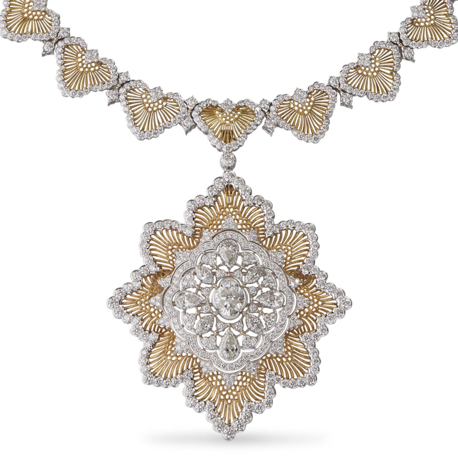 项链采用由手工制作的珠罗纱和蜂巢状三角形元素打造,缀以白金和钻石花环镶边,该镶边由白金和钻石的菱形元素分割开来。叶形白金结构将项链与胸针相连,胸针中央饰以蕾丝状白金饰件,并镶嵌一颗布契拉提切型钻石,四周环绕着泪滴状镶钻梭形底座。