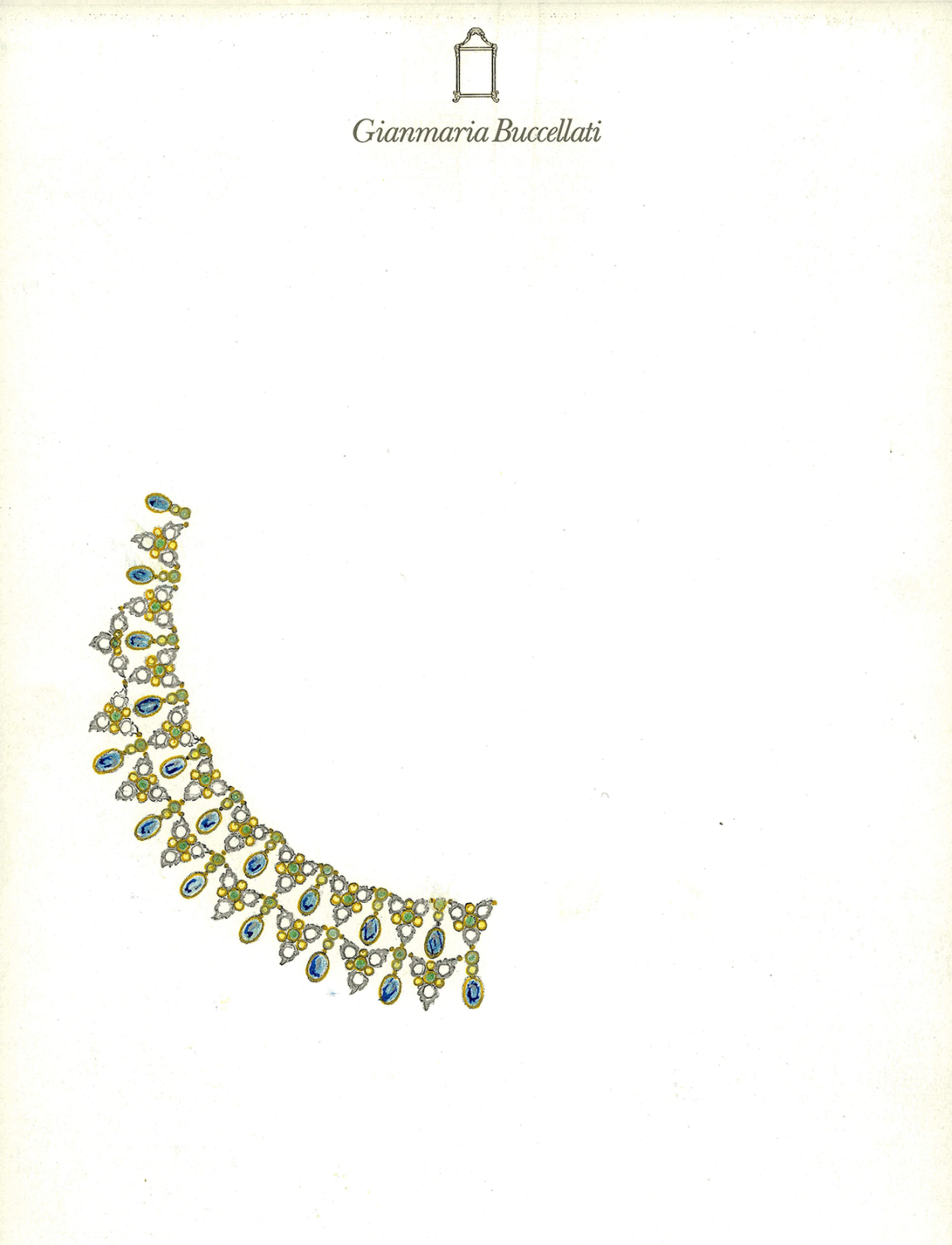 这条项链的设计灵感源自印度的绚丽色彩,是极致奢华的礼赞。安德烈·布契拉提(Andrea Buccellati)沿袭父亲的传统,重新演绎了自1970年代以来深受詹马利亚(Gianmaria)喜爱的围嘴项链造型。这一设计不禁让人联想到斋浦尔王宫的建筑之美——精致拱门、锦缎和挂毯织就的华丽感。项链由三片白金叶片簇成,镶嵌138颗明亮式切割钻石(4.65克拉),中间由黄金“modellato”和“rigato”雕工底座相衔接,分别镶嵌93颗圆形刻面祖母绿(4.85克拉)和176颗花式切割钻石(3.73克拉)。黄金的色泽、祖母绿的深绿色和花式切割钻石的亮黄色交相辉映,致敬印度的草木葱茏和藏红花田。中央椭圆形黄金底座呈泪滴状,雕刻“modellato”纹饰,镶嵌43颗椭圆形刻面蓝宝石(23.38克拉),令整件作品更显华贵。