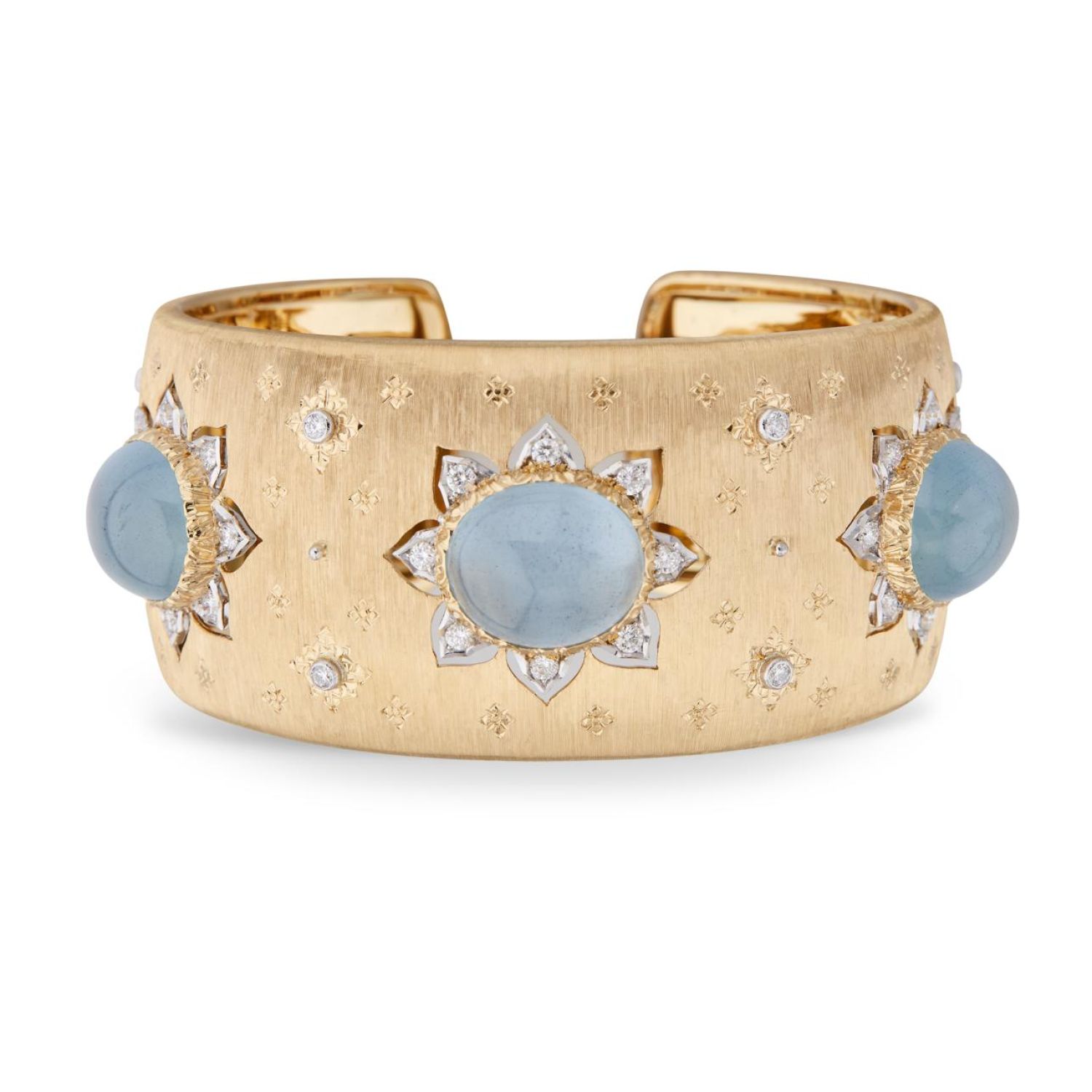 Stone: N.34 ROUND BRILLIANT-CUT DIAMONDS CT. 0.98; N.3 CABOCHON AQUAMARINE CT. 25.69 |