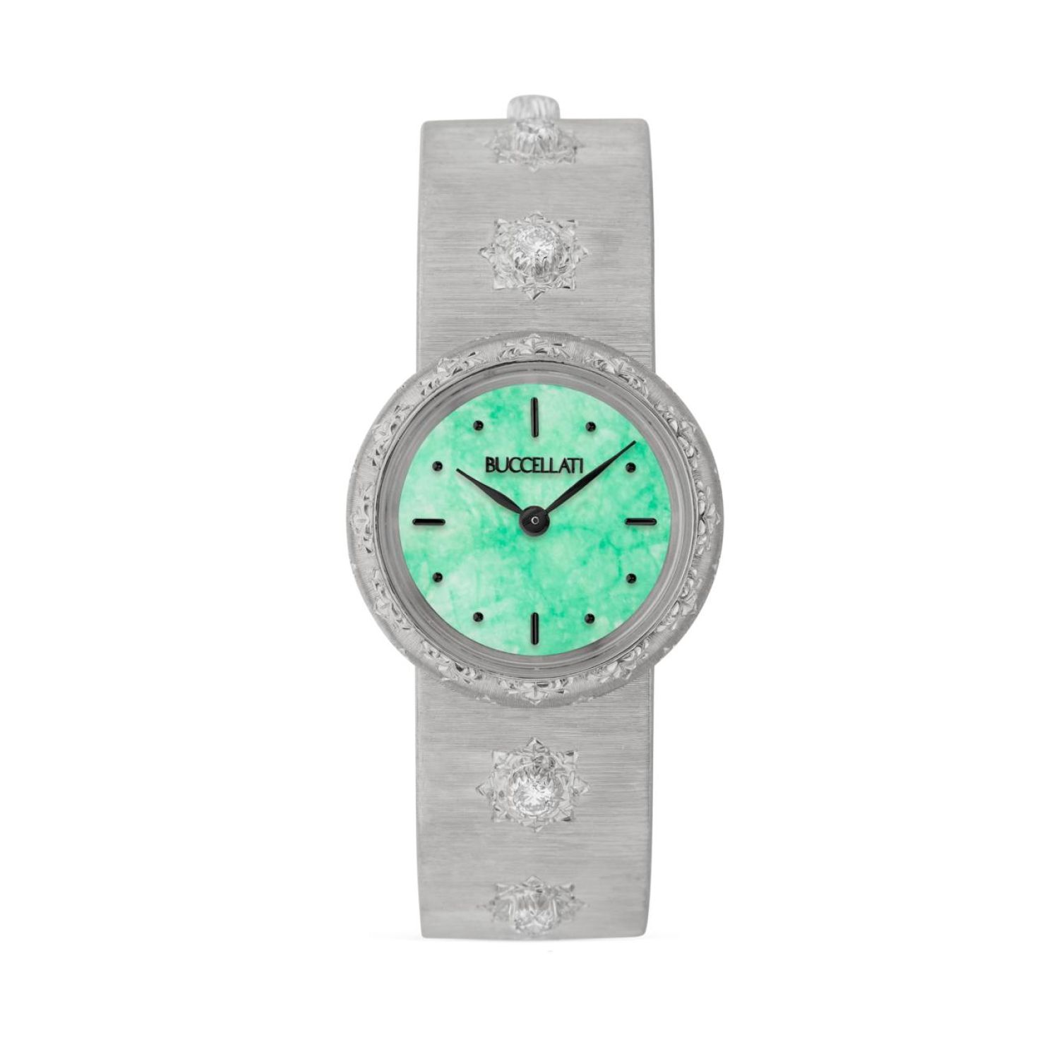 白金手镯链腕表,润饰rigato雕工纹饰。镶钻白金饰圈。润饰Ornato的表壳。玉石表盘。
