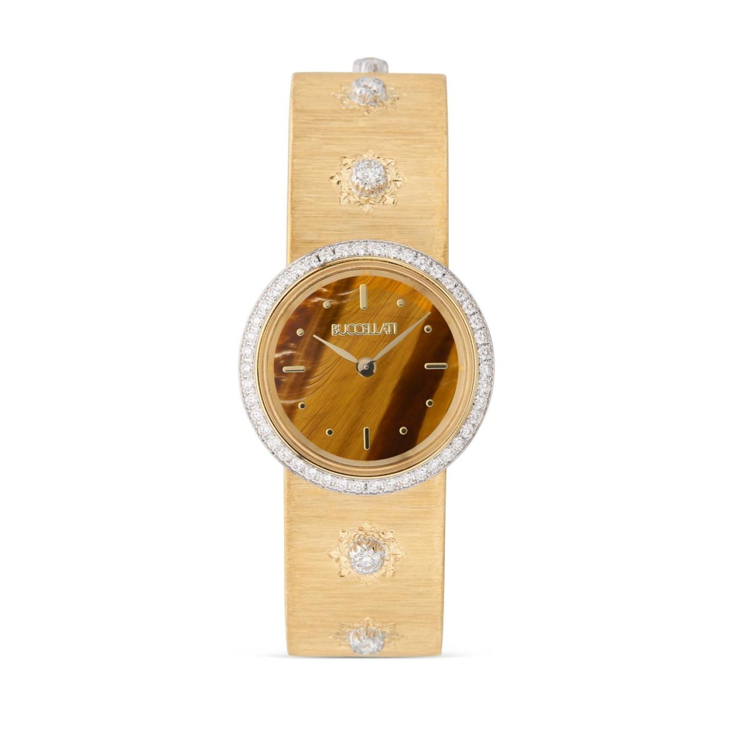 黄金手镯链腕表,润饰rigato雕工纹饰。镶钻白金饰圈。镶钻表壳。虎眼石表盘。