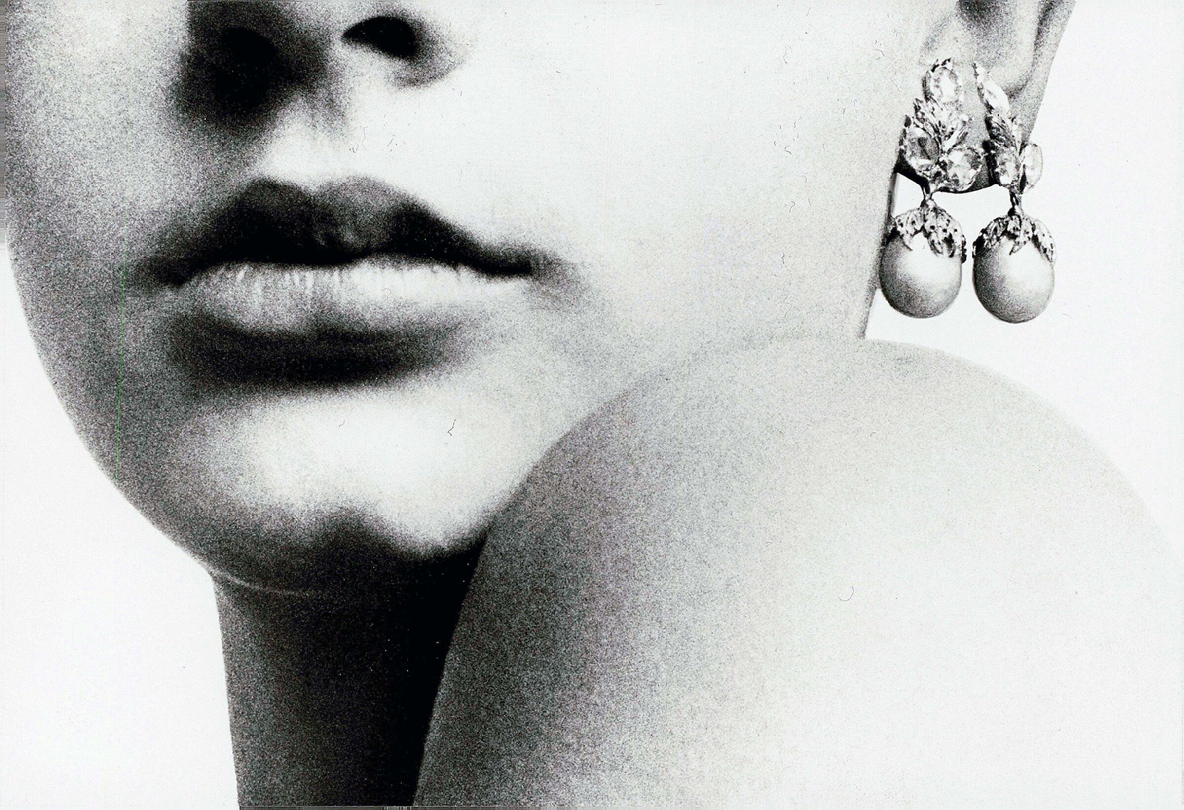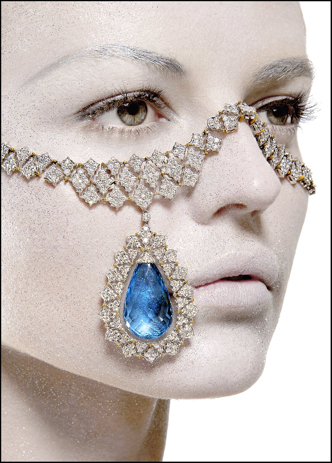 模特Iryna Rozhiyk佩戴着一枚镶嵌海蓝宝石和钻石的水滴形吊坠,由Vincent Alvarez为Soon Magazine(2007)拍摄。