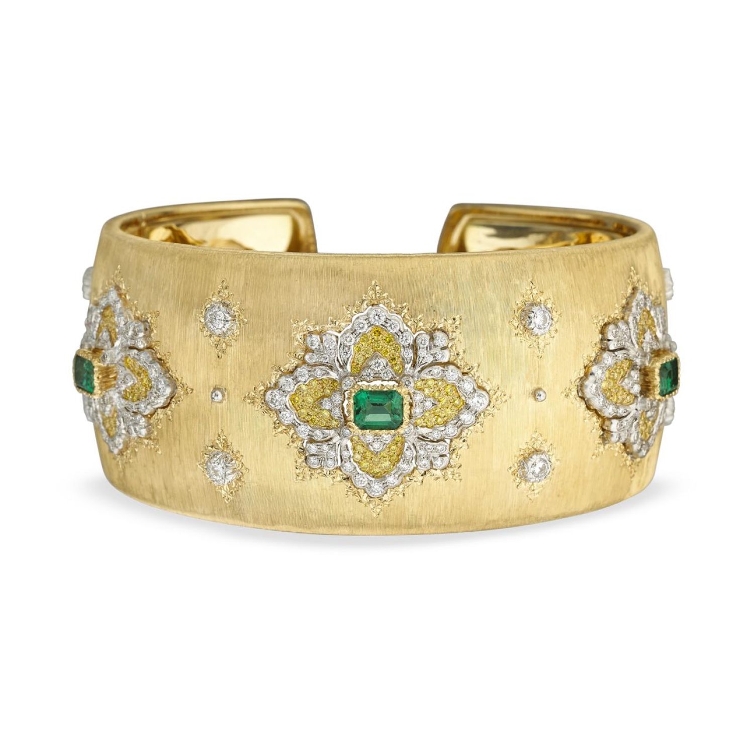 这款黄金手镯缀以三个白金花环图案,四周环绕rigato和ornato雕工纹饰。镶嵌祖母绿的叶片,组成八角形中心底座,四周密镶黄钻,缀以镶嵌明亮式切割钻石的白金饰圈。戒指宽度3.00厘米,镶嵌200颗圆形明亮式切割钻石(1.61克拉)、3颗祖母绿(1.24克拉)和156颗黄钻(0.58克拉)。