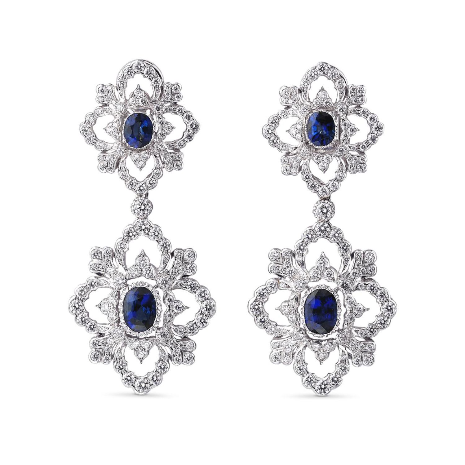 这对白金吊坠耳环由镶钻花环图案和扇形组成,雕刻rigato横向纹饰,缀以椭圆形白金叶片饰圈,中心镶嵌蓝宝石。可拆式吊坠由镶钻白金饰圈衔接。 镶嵌274颗圆形明亮式切割钻石(3.81克拉)和4颗椭圆形刻面蓝宝石(5.67克拉)。
