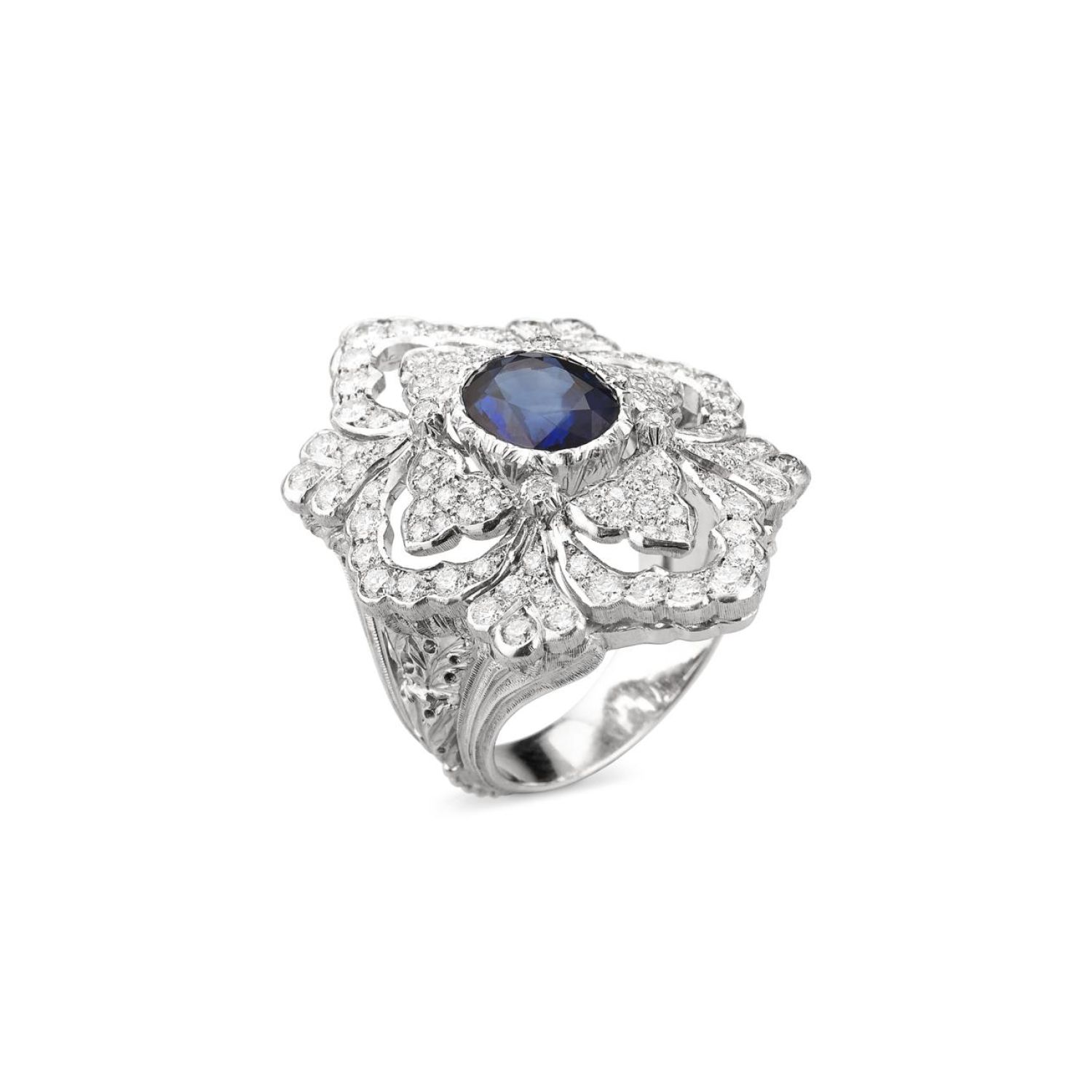 这款白金戒指由镶有钻石的花环和扇形物组成,横向润饰Rigato雕工纹饰,中心是一个镶有蓝宝石的叶形椭圆形白金饰件。 白金鳞纹戒圈,带中间叶片造型部分。 镶嵌100颗圆形明亮式切割钻石(1.44克拉)和1颗椭圆形刻面蓝宝石(2.79克拉)。