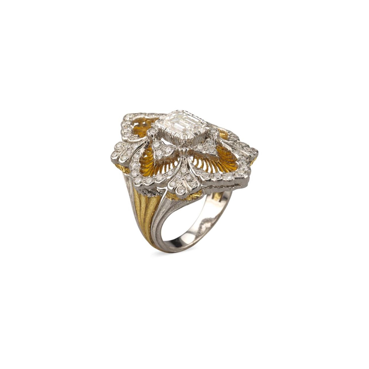 这款戒指由镶有钻石的白金扇形物和花环组成,横向润饰rigato雕工纹饰,中心是镶钻八角形白金叶形饰件。黄金径向珠罗纱工艺。鳞纹戒圈,两侧黄金,中间白金。镶嵌72颗圆形明亮式切割钻石(1.03克拉)和1颗钻石(1.55克拉)。