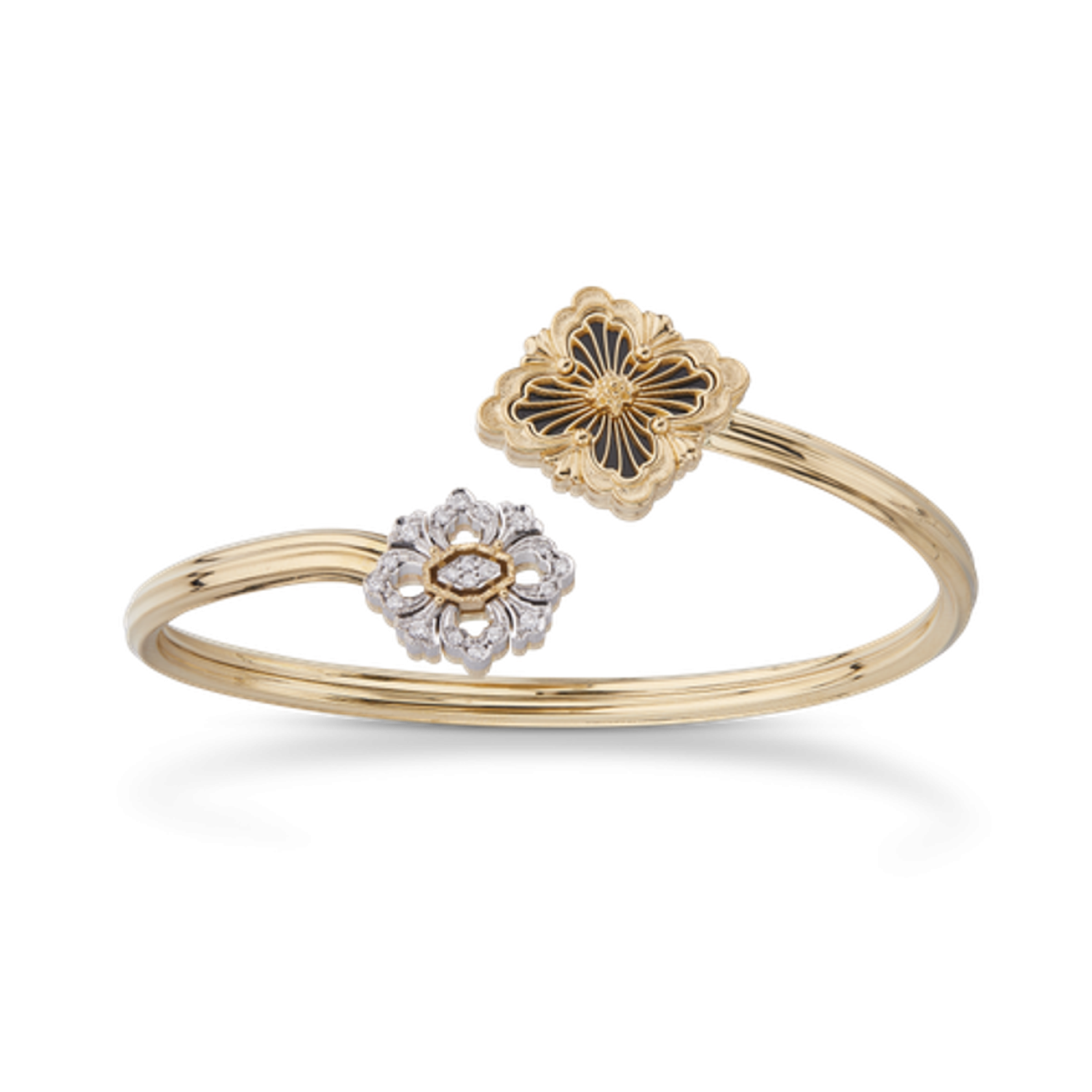 Opera Tulle bangle手镯由双层黄金扇形边框组成标识性图案,以玛瑙材质为底,上附辐射状薄纱,正中央黄金底座上镶有钻石。扇形边框和闪亮黄金圆珠。镯圈皆以“Rigato”雕刻工艺制成。