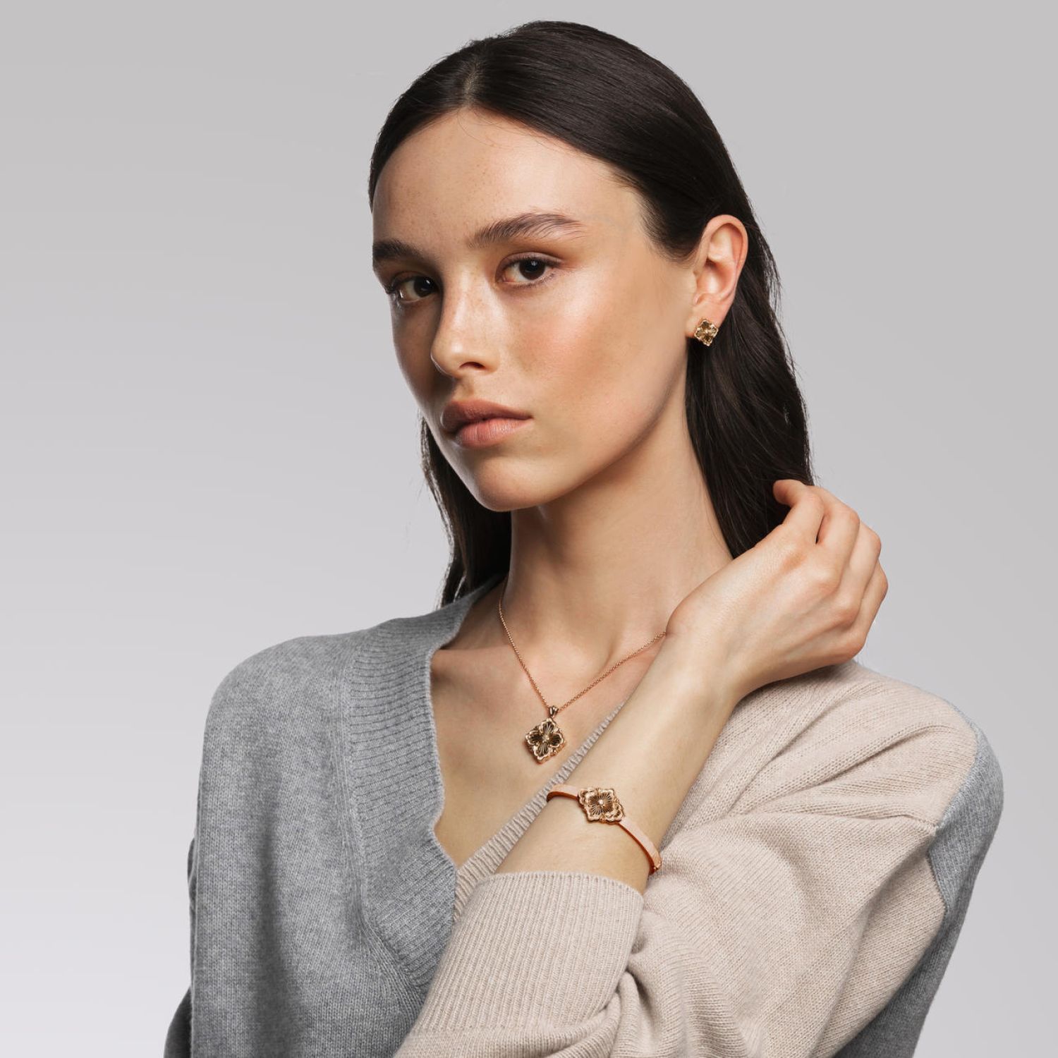 Opera Tulle耳钉,由黄金扇形边框组成标识性图案。红色珐琅衬底,上方叠加辐射状珠罗纱,中央镶嵌黄金雕刻的星芒,边缘点缀黄金珠。