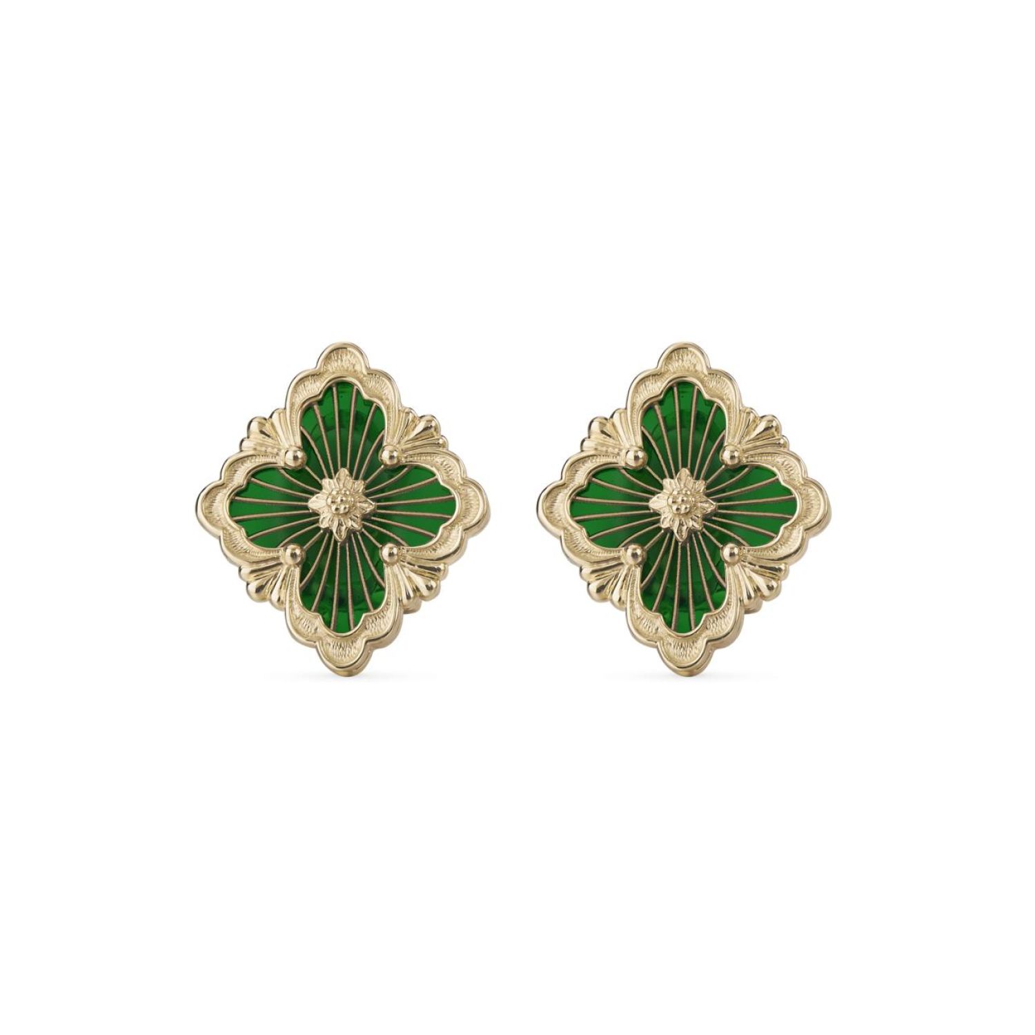 Opera Tulle耳钉,由黄金扇形边框组成标识性图案。绿色珐琅衬底,上方叠加辐射状珠罗纱,中央镶嵌黄金雕刻的星芒,边缘点缀黄金珠。