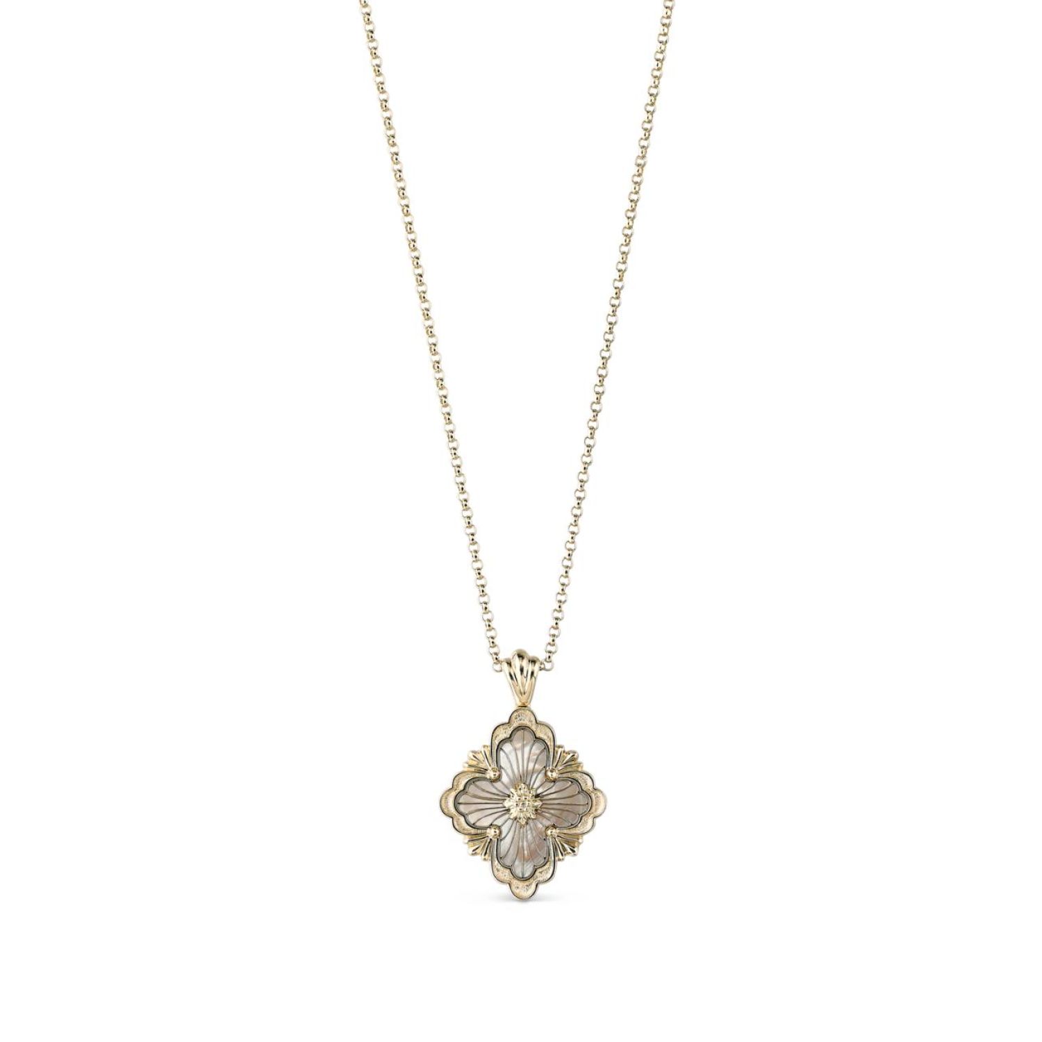 Opera Tulle吊坠,由黄金徽标元素组成,贝母衬底,顶部饰有辐射状珠罗纱,中央嵌入黄金玫瑰花环。带有扇形边框。黄金项链。