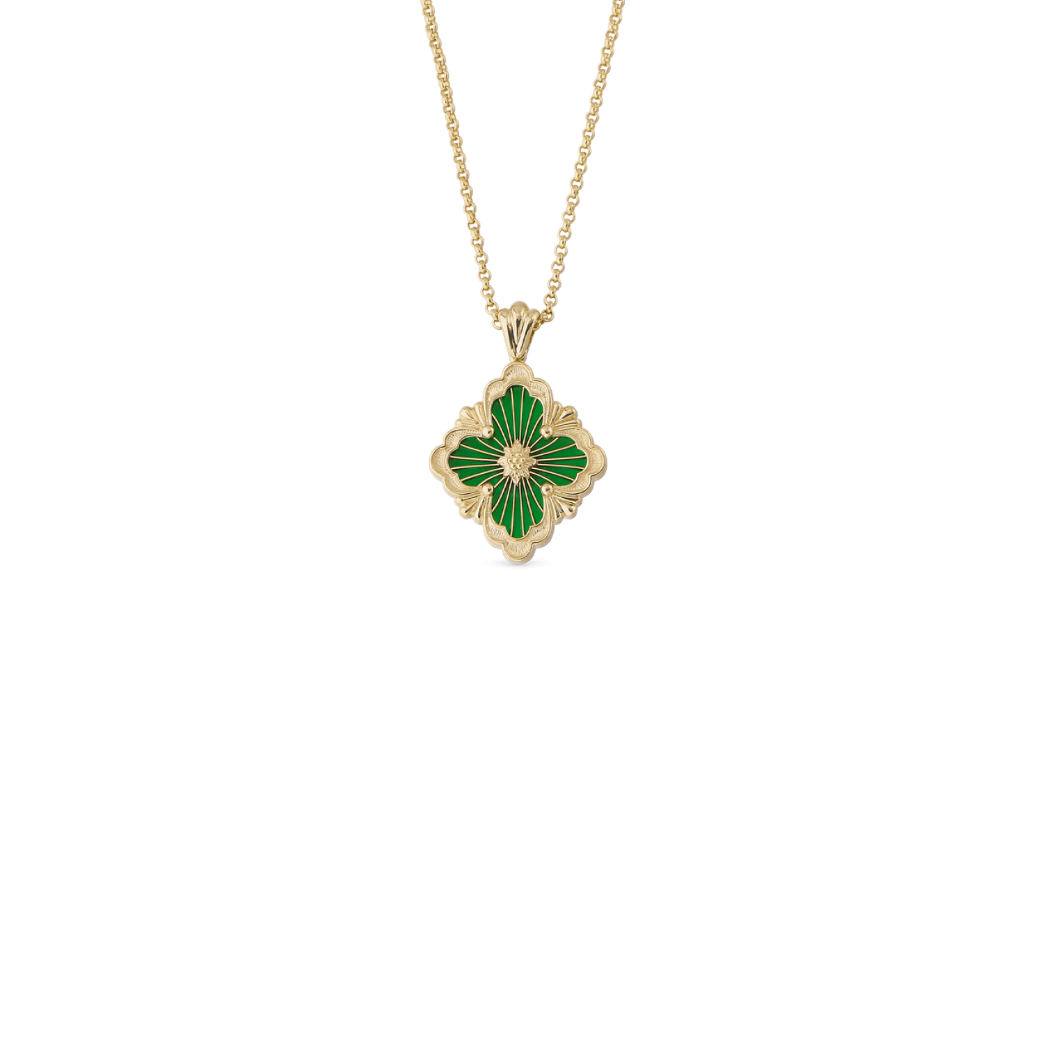 Opera Tulle吊坠,由黄金徽标元素组成,绿色珐琅衬底,顶部饰有辐射状珠罗纱,中央嵌入黄金玫瑰花环。带有扇形边框。黄金项链。