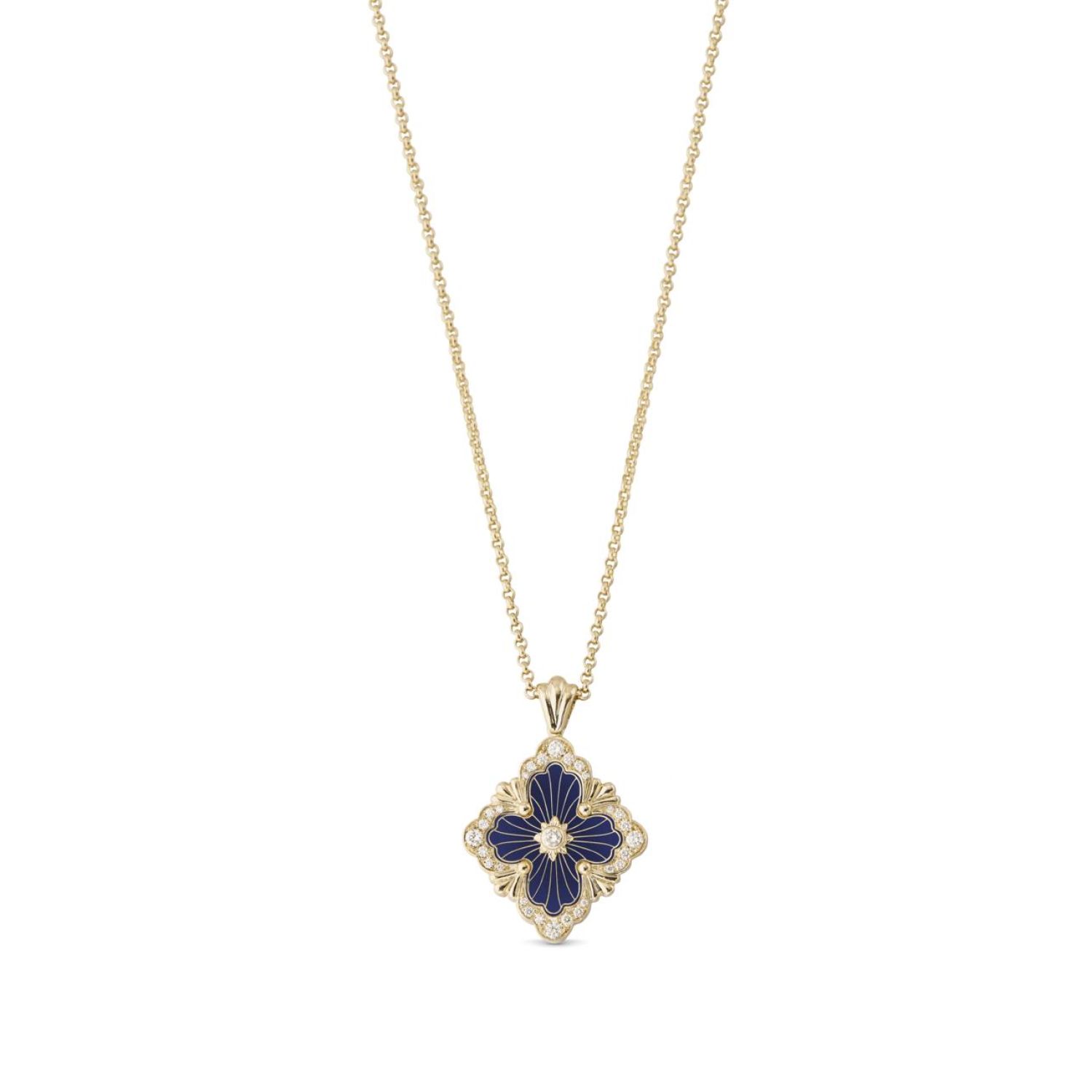 黄金吊坠,缀以钻石、蓝色珐琅饰件和辐射状珠罗纱图案。