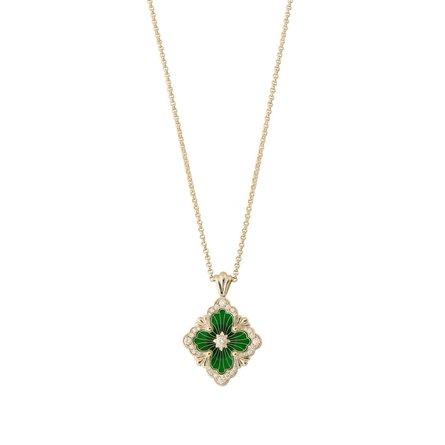 Opera Tulle吊坠,由黄金徽标元素组成,绿色珐琅衬底,顶部饰有辐射状珠罗纱,中央嵌入镶钻黄金玫瑰花环。带有扇形边框并镶有钻石。黄金项链。