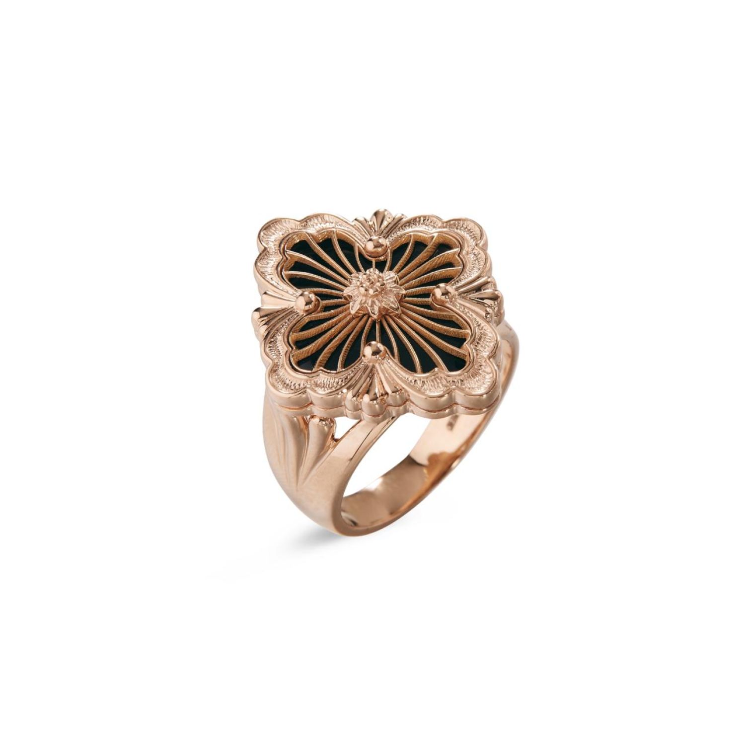 Opera Tulle戒指,由玫瑰金徽标元素组成,缟玛瑙衬底,顶部饰有辐射状珠罗纱,中央嵌入玫瑰金玫瑰花环。扇形边框和闪亮玫瑰金圆珠。
