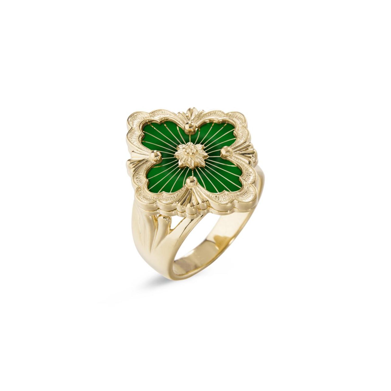 Opera Tulle戒指,由黄金徽标元素组成,绿色珐琅衬底,顶部饰有辐射状珠罗纱,中央嵌入黄金玫瑰花环。扇形边框和闪亮黄金圆珠。