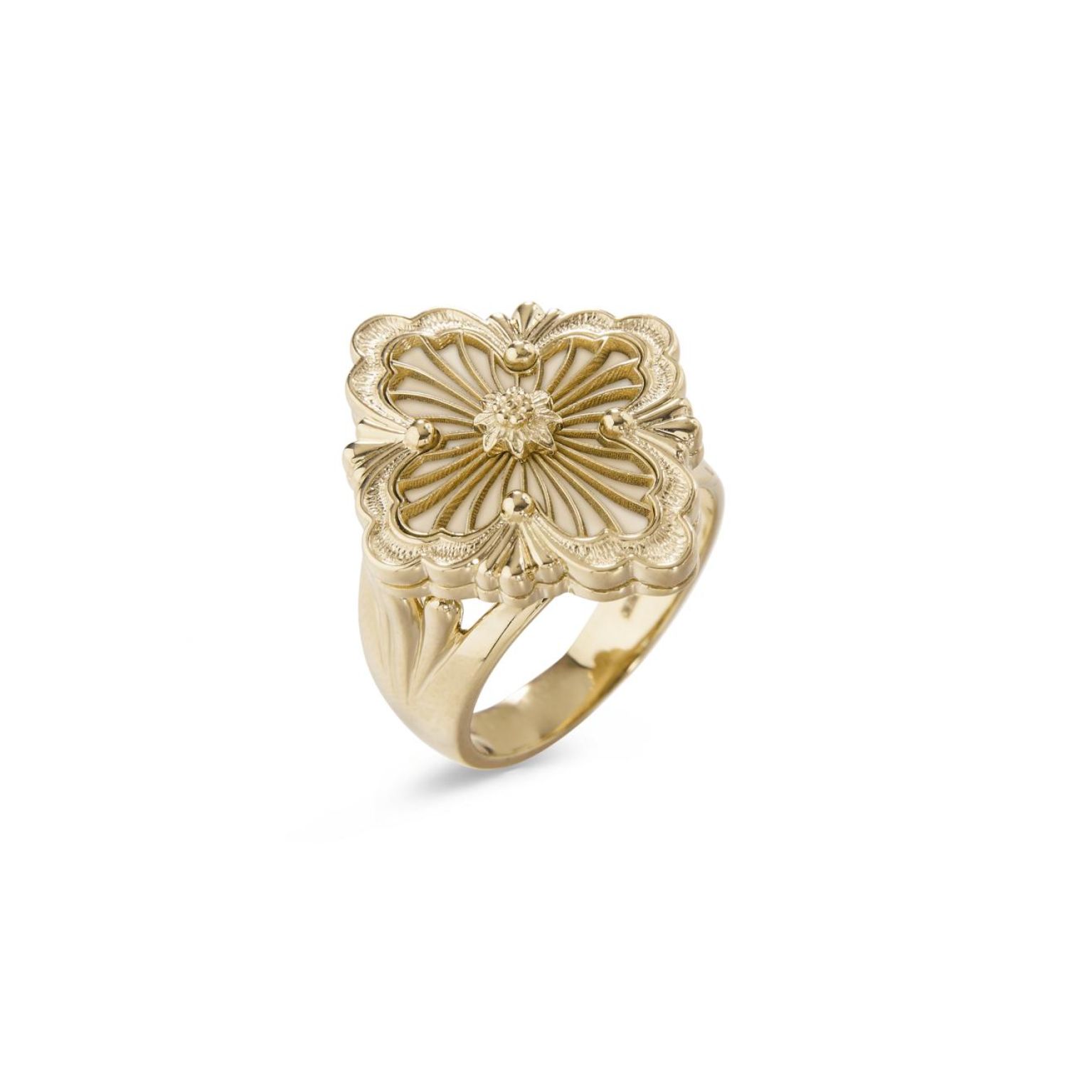 Opera Tulle戒指,由黄金徽标元素组成,贝母衬底,顶部饰有辐射状珠罗纱,中央嵌入黄金玫瑰花环。扇形边框和闪亮黄金圆珠。
