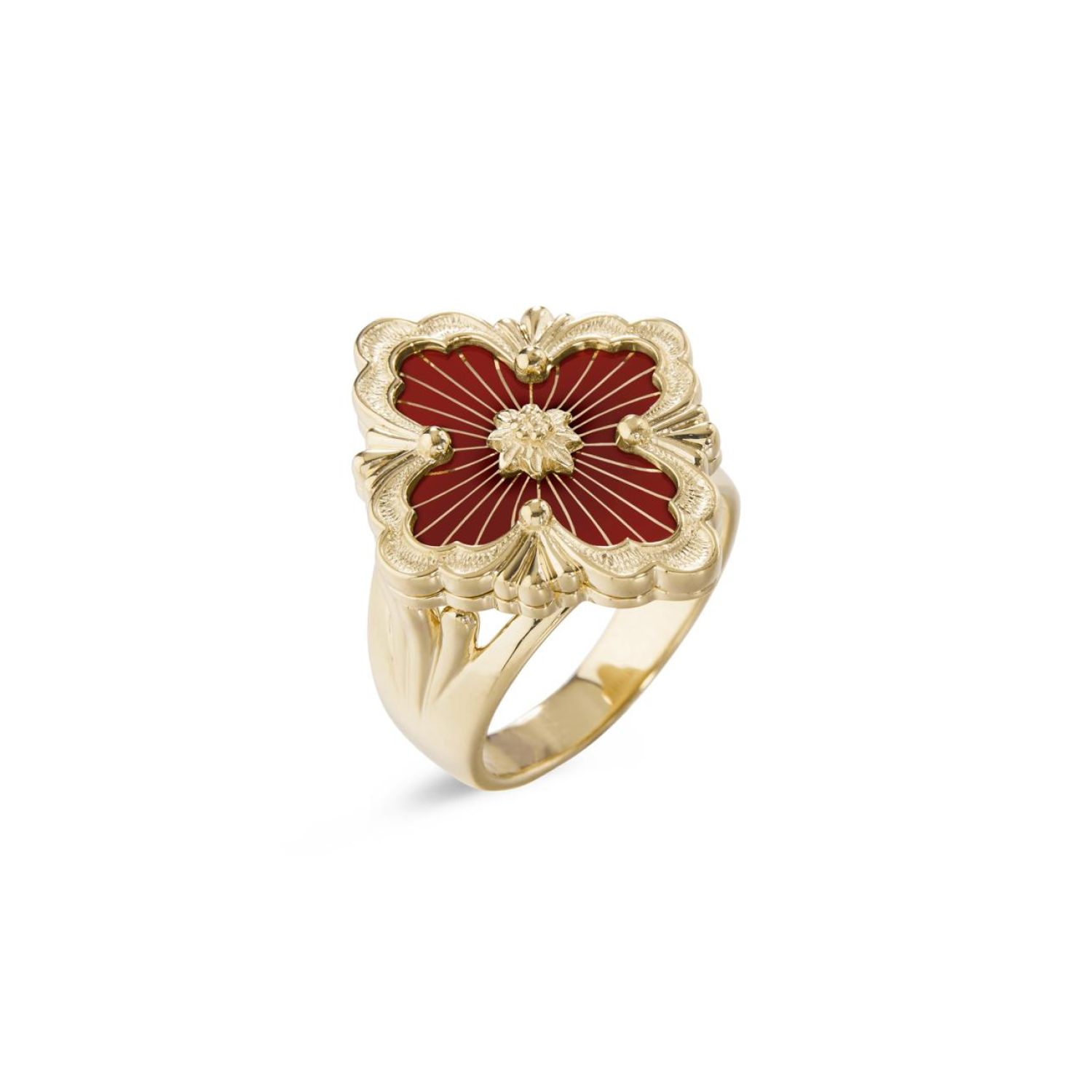 Opera Tulle戒指,由黄金徽标元素组成,红色珐琅衬底,顶部饰有辐射状珠罗纱,中央嵌入黄金玫瑰花环。扇形边框和闪亮黄金圆珠。