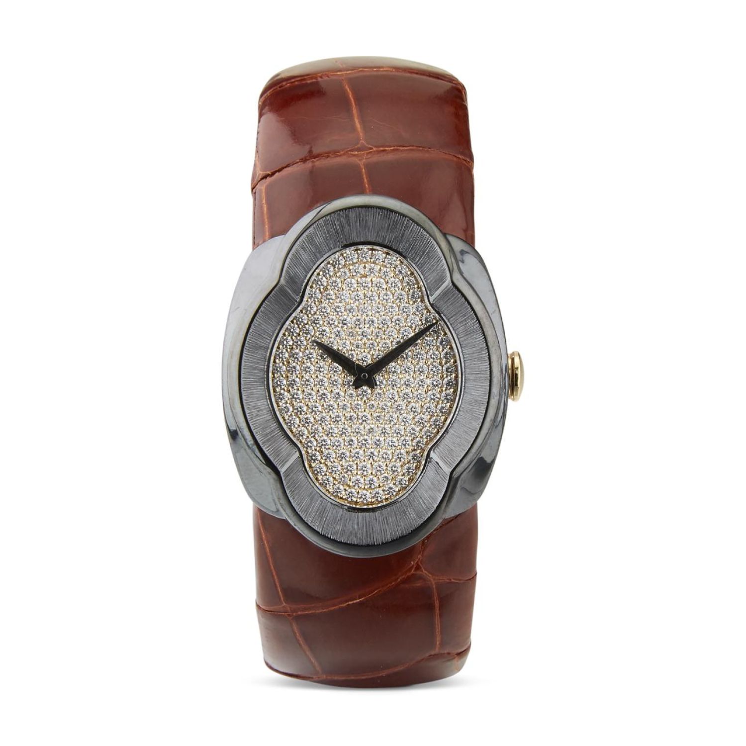青铜鳄鱼皮表带。类金刚石(DLC)涂层工艺黄金表壳。全密镶钻石表盘。