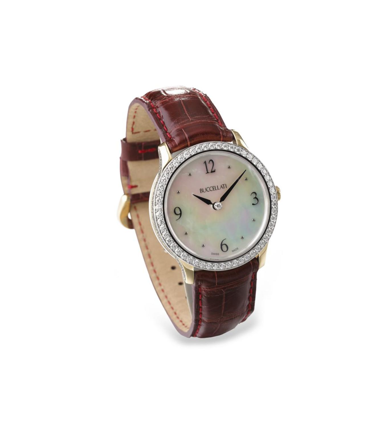 鳄鱼皮表带。镶钻表壳。珍珠贝母表盘。