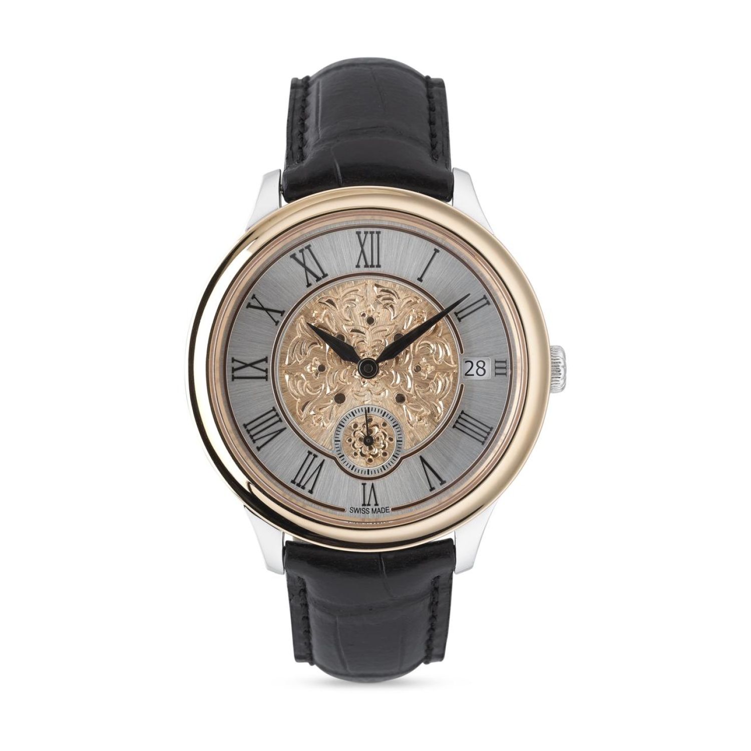 男士白金和玫瑰金皮革雕花金表. 表壳直径:41 毫米 - 机芯:瑞士Vaucher机芯