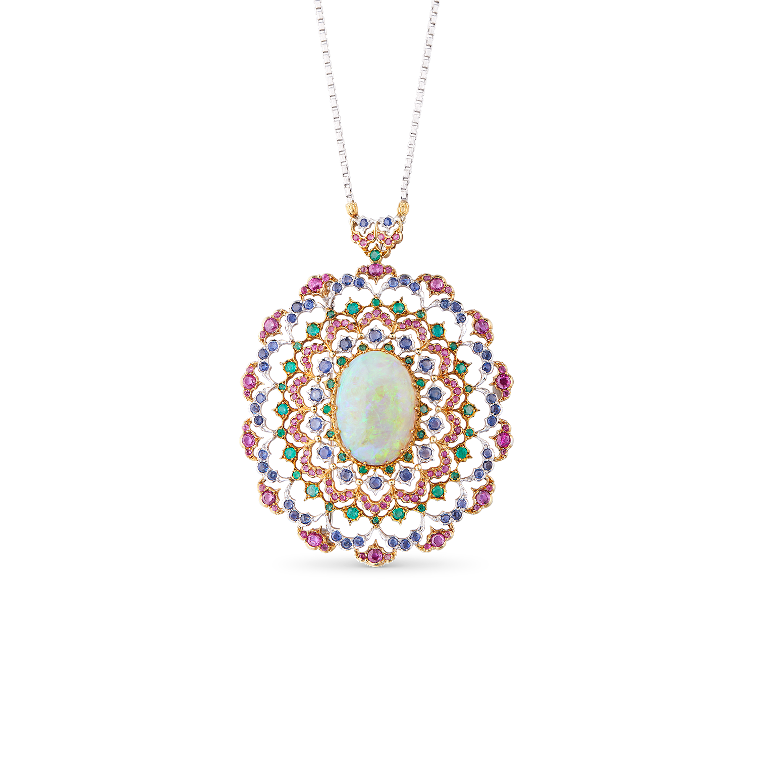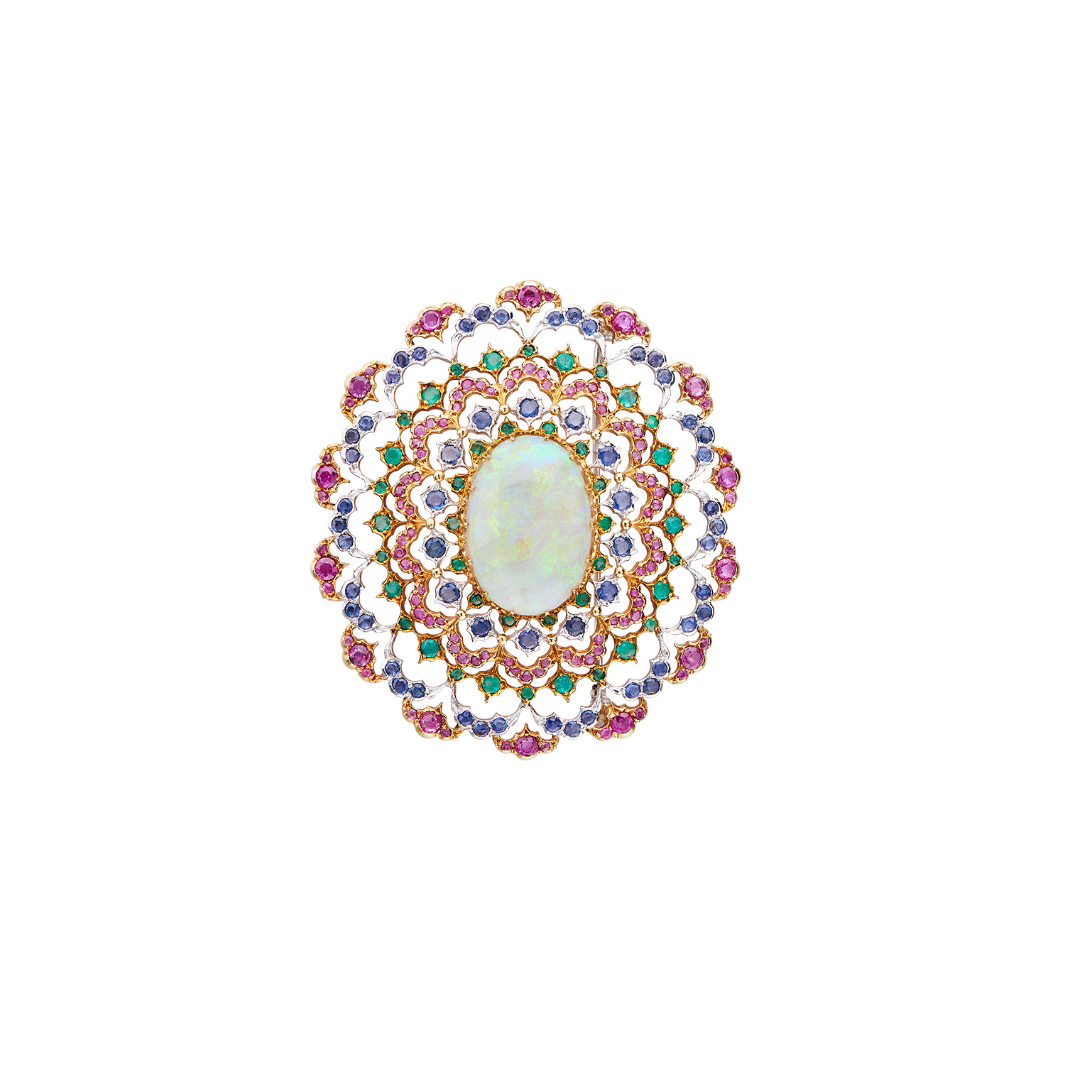 见到美雅至极的11.71克拉蛋白石,Gianmaria Buccellati灵感乍现,将其镶嵌于润饰花环图案的经典椭圆形胸针/吊坠。