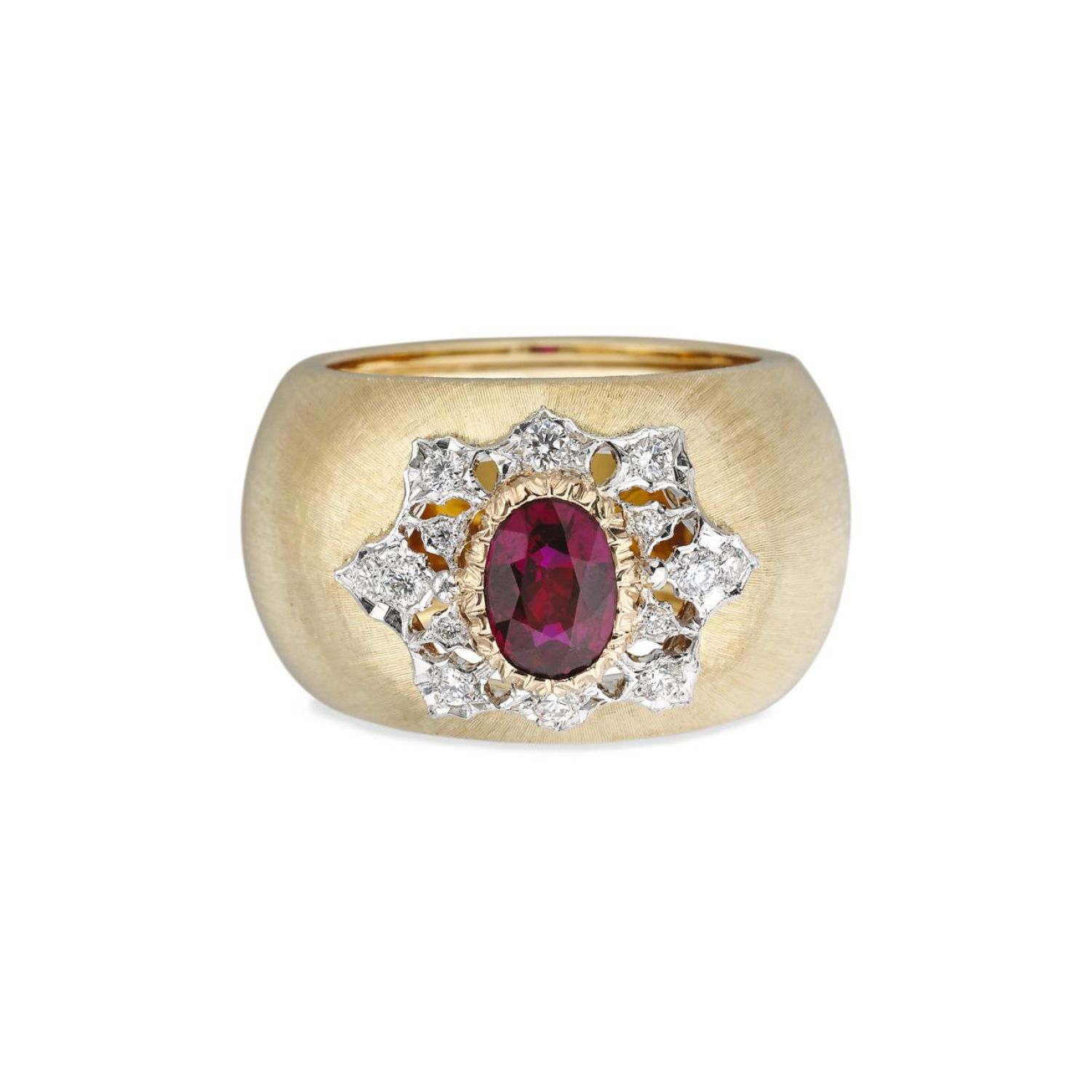 这款圆形黄金戒指润饰rigato a raggiera雕工纹饰和白金玫瑰花结和钻石,中心椭圆形玫瑰金饰件镶嵌红宝石。镶嵌1颗椭圆形刻面红宝石和(1.15克拉)14颗圆形明亮式切割钻石(0.21克拉)。
