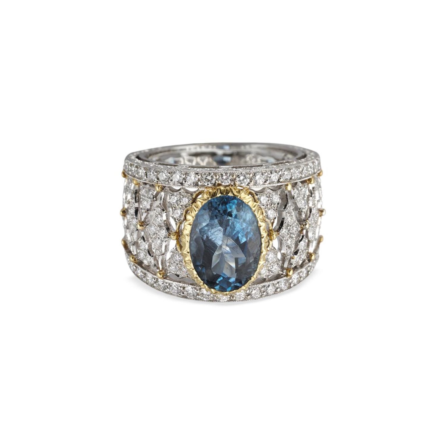 白金鳞纹戒圈,边缘镶钻。中心黄金底座镶嵌单片海蓝色叶片。白金和镶钻边饰,底部润饰Ornato雕工纹饰。镶嵌98颗圆形明亮式切割钻石(0.86克拉)和1颗刻面海蓝宝石(2.89克拉)。