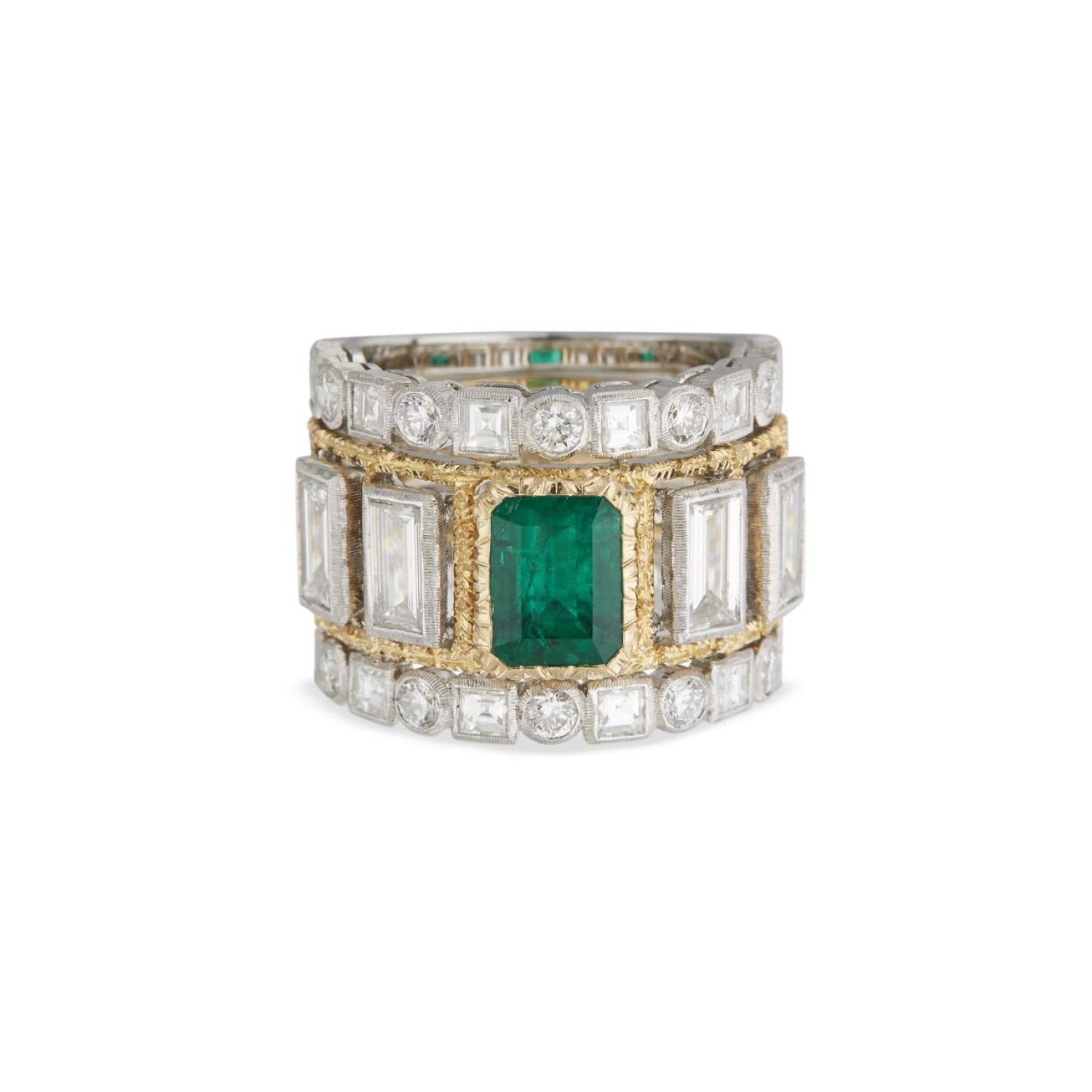 这款白金戒指中央黄金八角形饰件镶嵌一片祖母绿叶片,两侧是四个润饰rigato的白金饰圈,镶嵌法棍形钻石。背面是润饰中心星形纹饰的rigato和ornato雕工纹饰。相互掩叶片造型的黄金串。白金边饰由圆形和方形饰圈和镶钻饰件交替组成。镶嵌1颗1.57克拉绿宝石,0.51克拉圆亮钻石,0.81克拉克拉钻石,1.24克拉钻石。