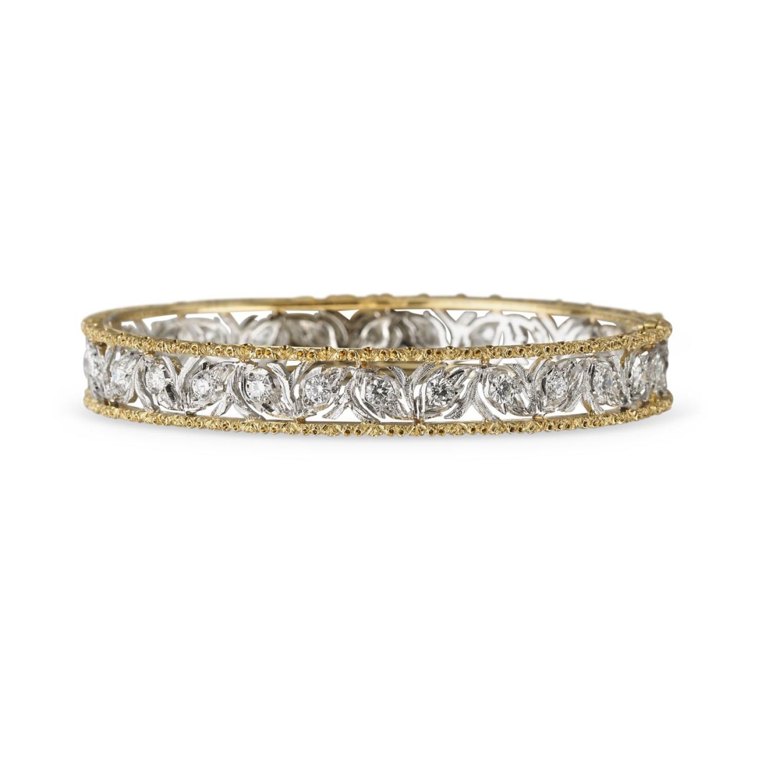 采用古法镂空雕工,制作创始人马里奥·布契拉提(Mario Buccellati)开创的Ramage图案:编织叶片和花朵细节,勾勒出独特轮廓。一片森林缀满钻石,为质地坚硬的金片镌刻几乎觉察不到的轻微纹理。之后,詹马利亚(Gianmaria)运用手工技艺,将Ramage雕工纹饰化繁为简,又增添了线条感与精巧。蜿蜒线条消失了,而小叶片沿着一条树枝竞相攀爬浮现出来。