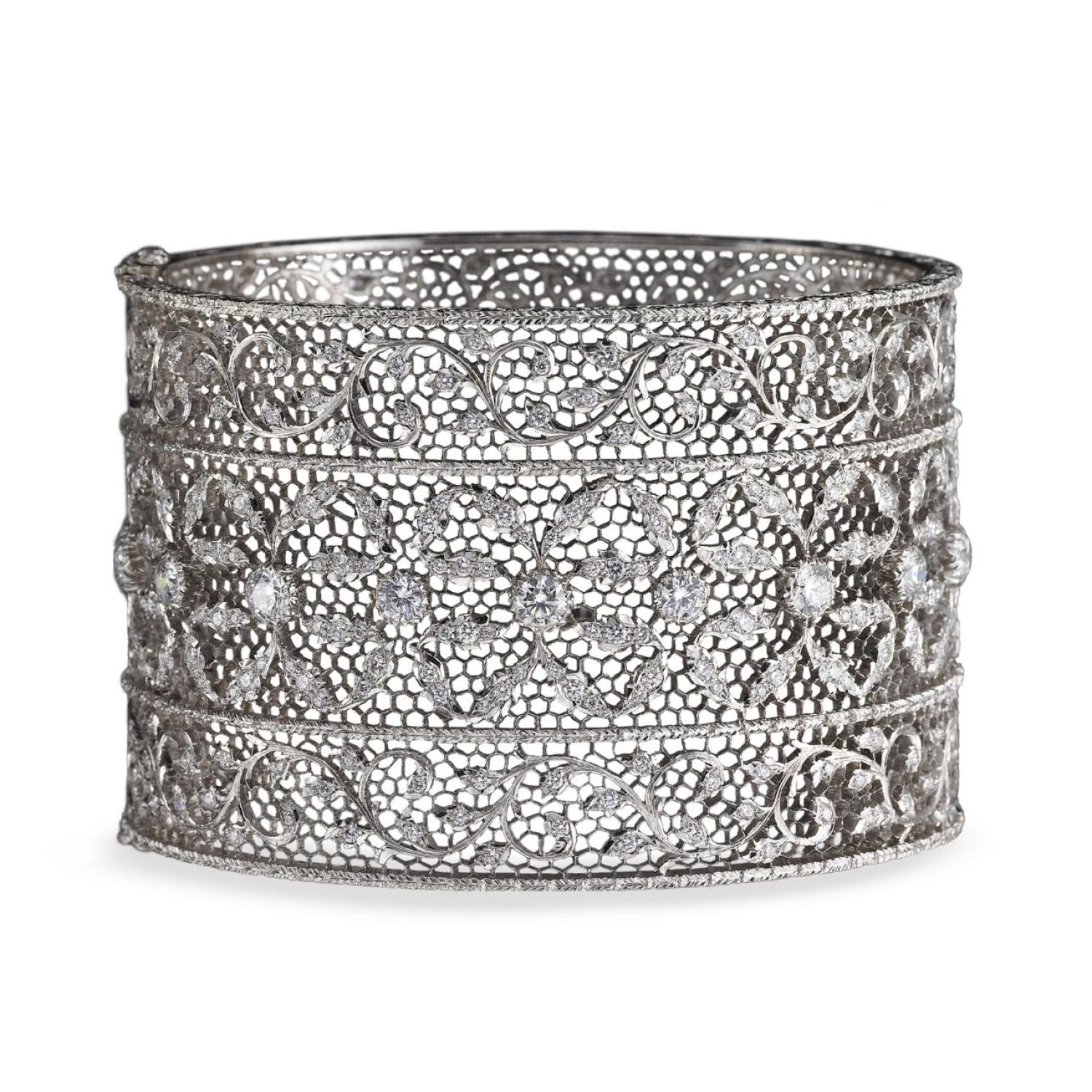 蜂巢是一种金匠技艺,需要高超的技巧。工匠必须在每个蜂巢单元上完成八道工序。制作这种类型的手镯需要数月的精雕细琢。然后方可彰显布契拉提的灵巧精致,并缀以文艺复兴风格的枝叶、浅色缎带和面纱上雨滴般晶莹剔透的钻石。