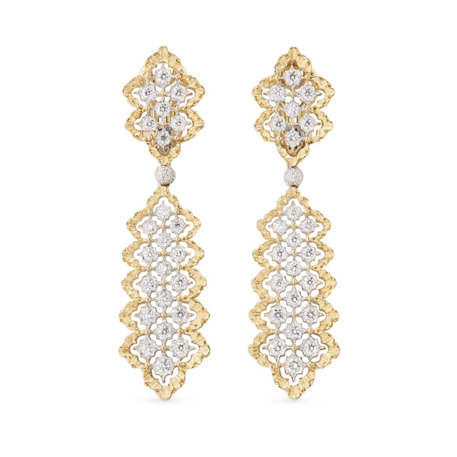 白金镶钻吊坠耳环,缀以扇形黄金镶边