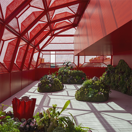 总部楼下的广场全为白色,米歇尔·德·卢奇方能玩转红色。Buccellati布契拉提和Venini为此次合作,选择了建筑设计中鲜见的红色。