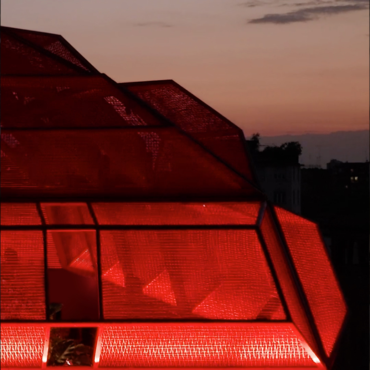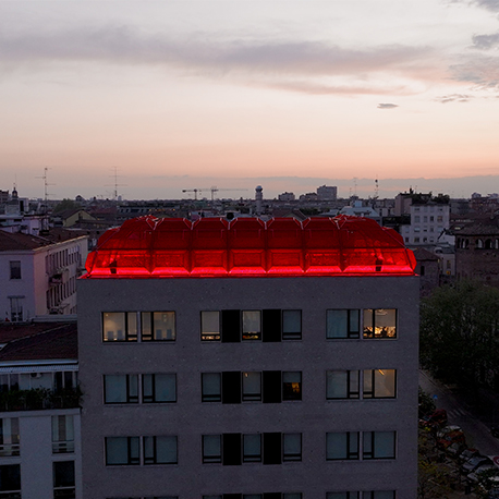 AMDL Circle工作室携建筑师、思想家兼艺术家米歇尔·德·卢奇(Michele De Lucchi)为2023年米兰国际家具展(Salone del Mobile 2023)设计了装置艺术品:现代万神殿,给门卢皮(Portaluppi)设计的露台戴上一顶大红帽。刻面和镂空结构,通透如凉亭,不禁让人想起钻石外形和宝石切工。