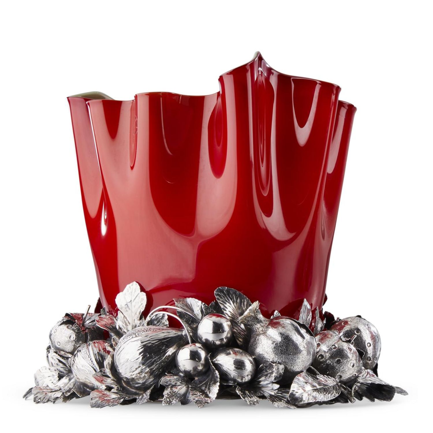 中号Venini玻璃花瓶。红色玻璃Fazzoletto花瓶,绿色内壁。银质支架及水果. 尺寸:底座直径29厘米 - 高度27厘米。有关订单问题,请联系我们的客户关系中心
