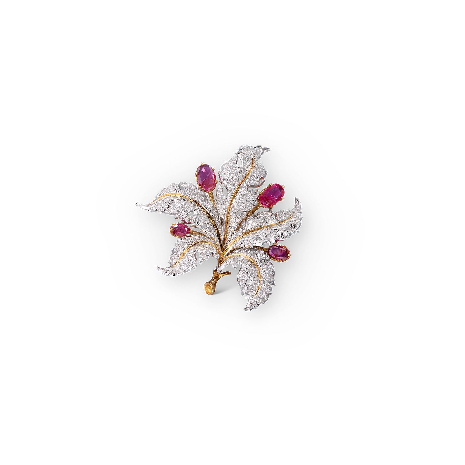 四朵黄金花蕾镶嵌凸圆形红宝石(2.80克拉),在枫叶映衬下格外出挑,愈发红艳。