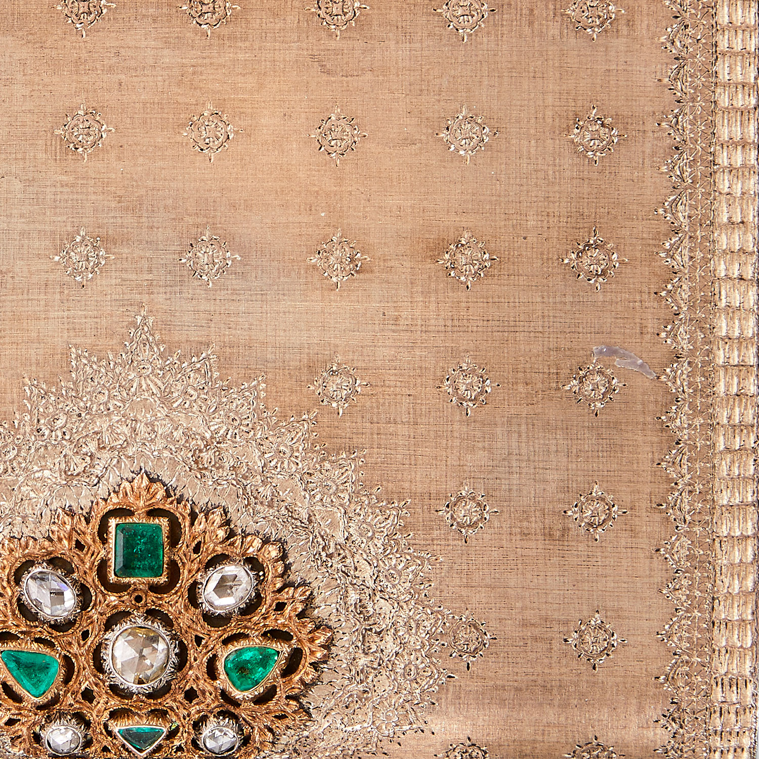 这款长方形化妆包采用telato雕刻纯银,并饰有小玫瑰花结。黄金搭扣被雕刻打造成蕾丝状,并进一步点缀六颗玫瑰形切割钻石(2.00克拉)和四颗祖母绿(3.50克拉)。