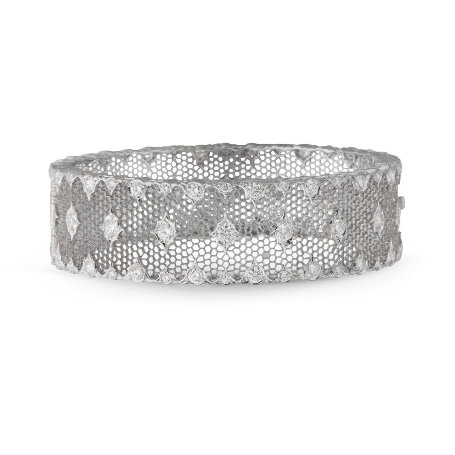 这一工艺亦称为“珠罗纱”,是最复杂的高级珠宝工艺之一。金匠要用近一个月时间,才能手工雕琢出一块半毫米金饰板,并在内微雕出镂空六边形花饰。宝石悬浮于若有似无的蜂巢镂空结构之上,该设计一经推出,广受推崇。