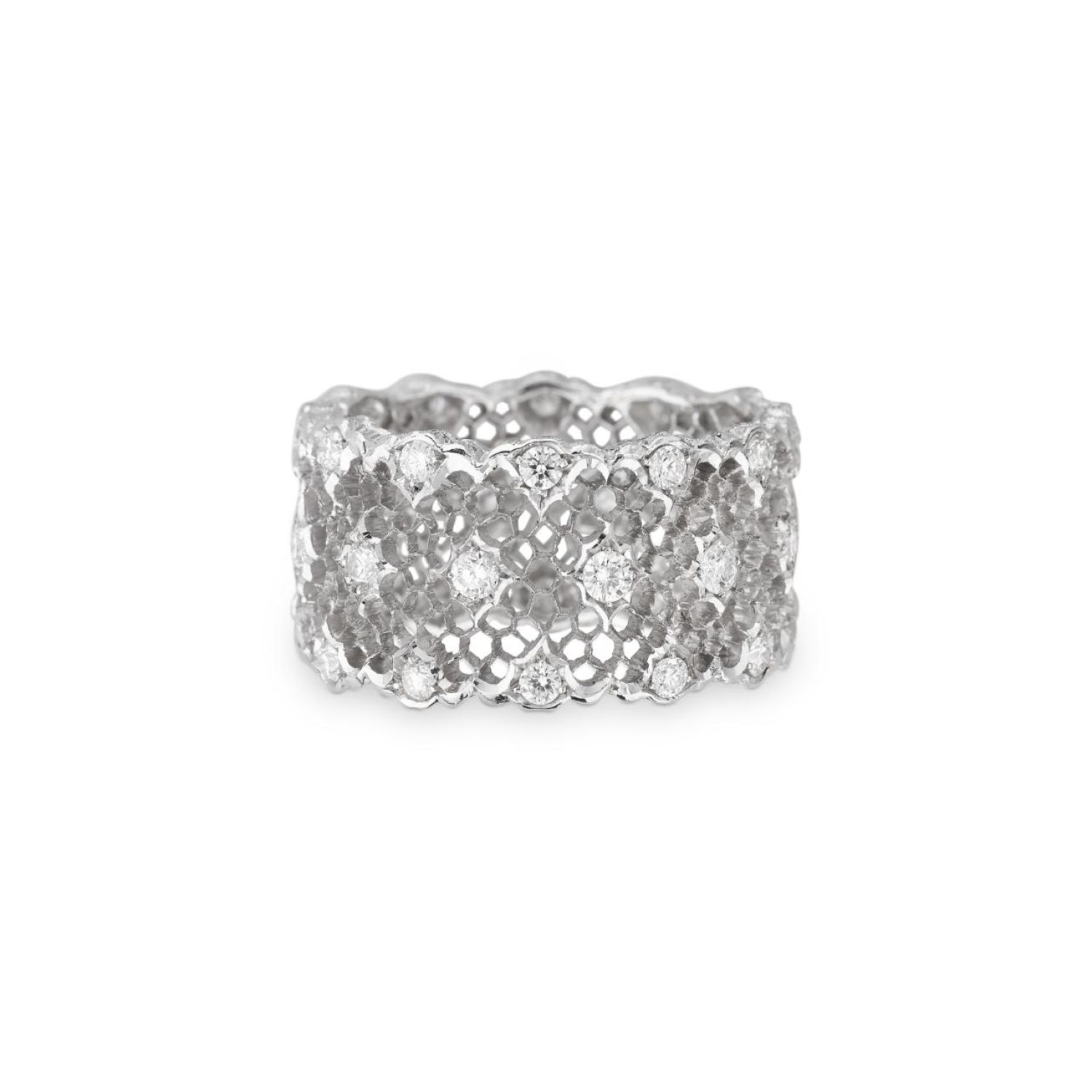这一工艺亦称为“珠罗纱”,是最复杂的高级珠宝工艺之一。金匠要用近一个月时间,才能手工雕琢出一块半毫米金饰板,并在内微雕出镂空六边形花饰。宝石悬浮于若有似无的蜂巢镂空结构之上,该设计一经推出,广受推崇。