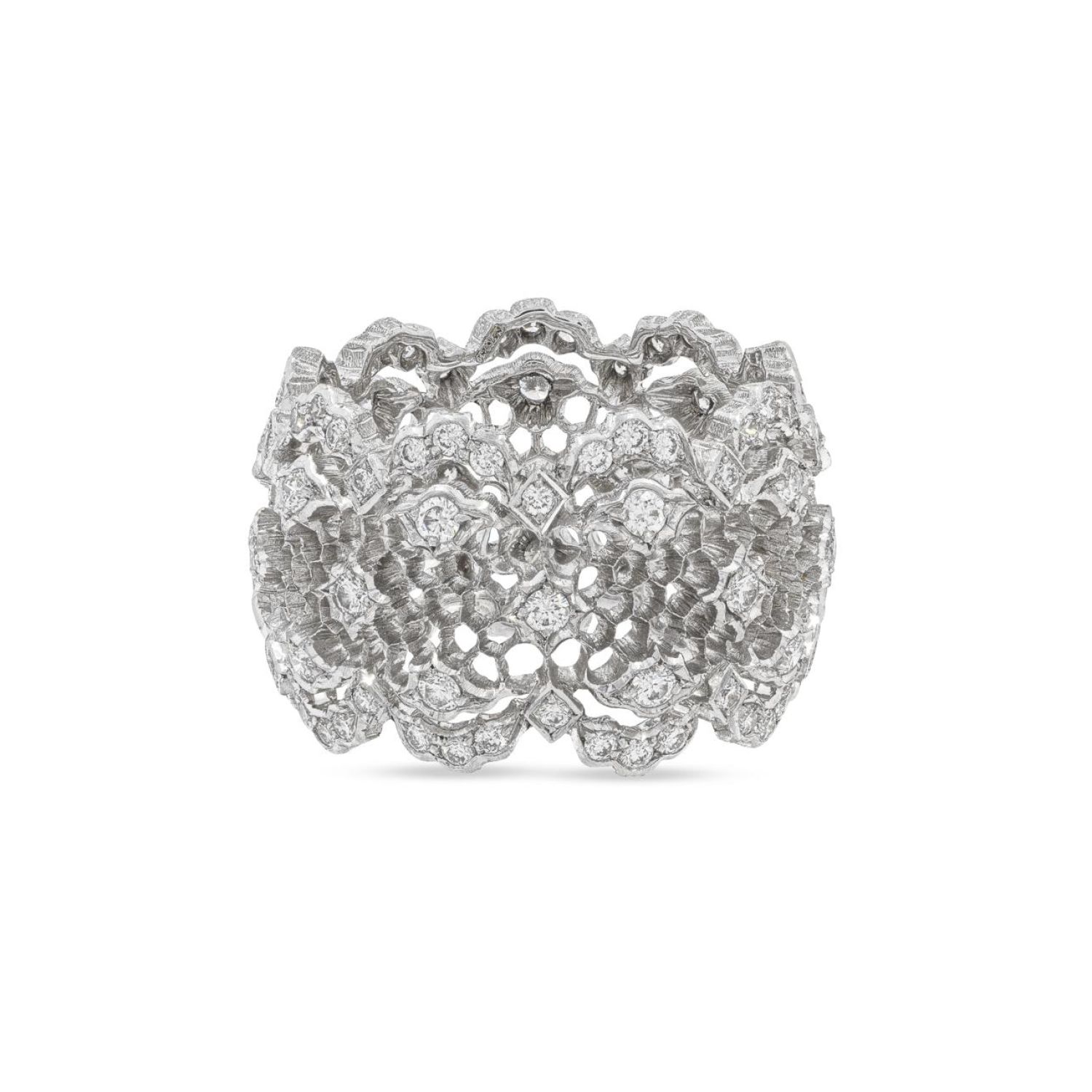 这一工艺亦称为“珠罗纱”,是最复杂的高级珠宝工艺之一。金匠要用近一个月时间,才能手工雕琢出一块半毫米金饰板,并在内微雕出镂空六边形花饰。宝石悬浮于若有似无的蜂巢镂空结构之上,该设计一经推出,广受推崇。