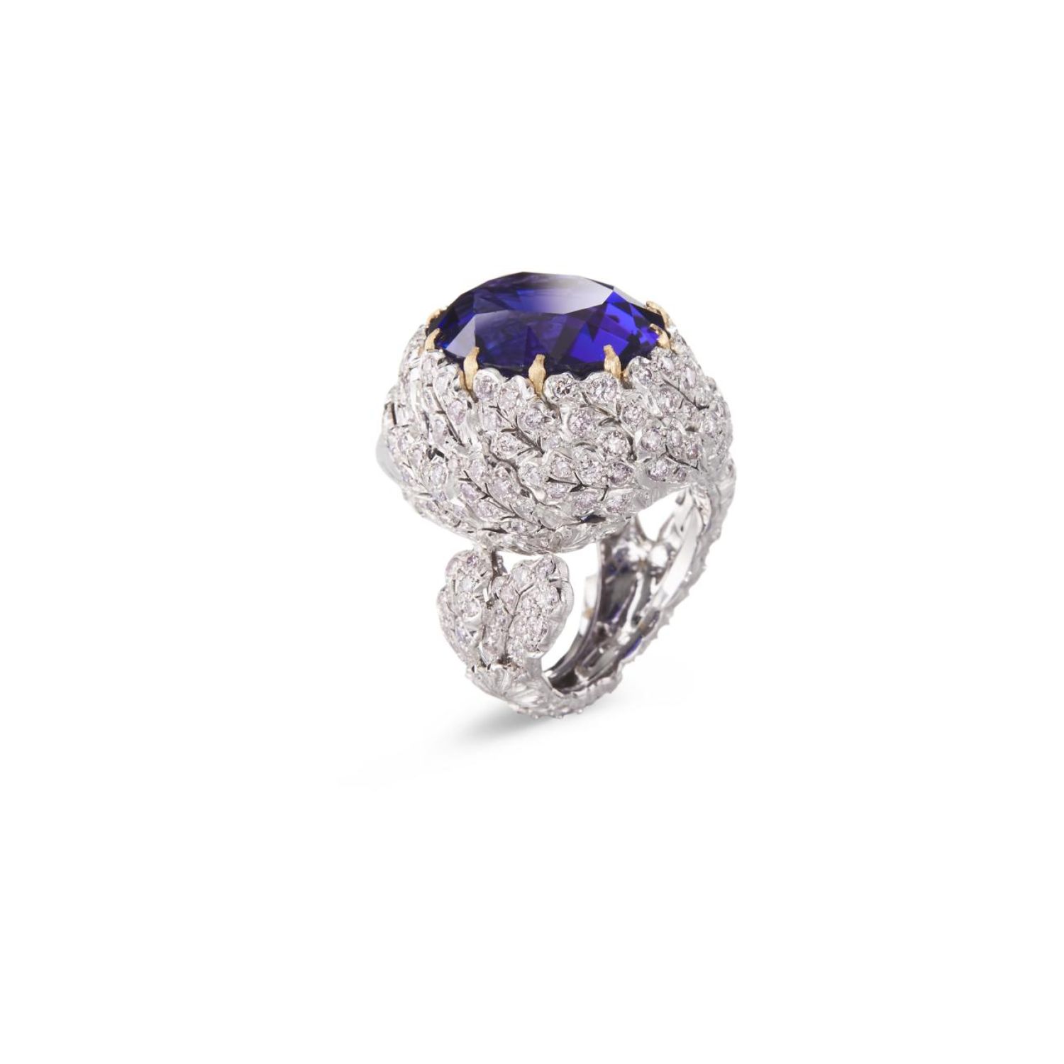 "AGAPANTO" Ring is dedicated to the unique blue flower of love, with a persistent and delicate fragrance. The asymmetric mounting is in white gold and diamonds, composed of elements that look very much like small petals wrapping up the central deep blue stone. Shiny beads and decorative elements in yellow gold.