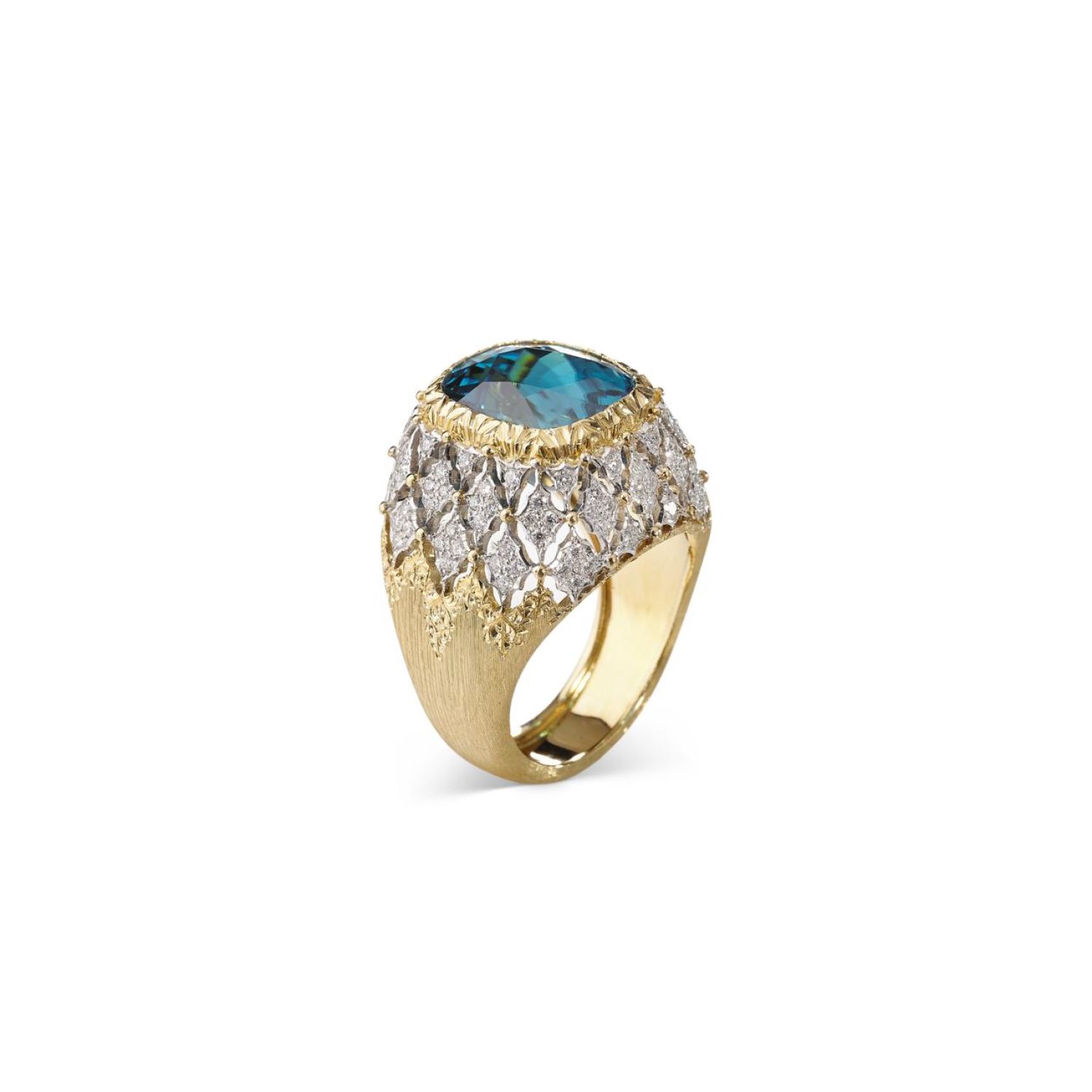 Cocktail ring in white gold perforated lace with diamonds. Centered bezel in yellow gold molded to a leaf with blue zircon. Yellow gold band engraved "rigato" with small rosettes. 1 faceted zircon 13.75 carats and 1 round brilliant diamond 0.67 carats.